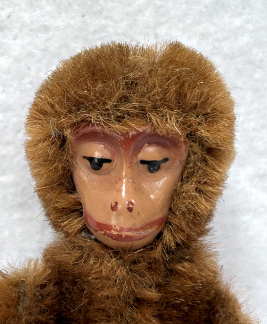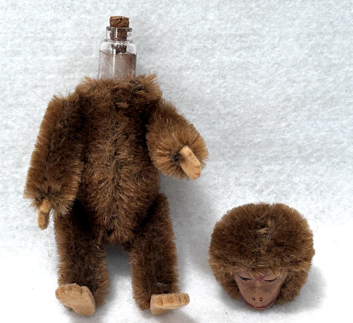 This adorable little mohair monkey was made by Schuco around 1929. The feet, ears and hands are shaped felt and the face is metal with light flocking on it (some age appropriate wear). The head lifts off to expose a hidden glass perfume bottle with original cork stopper. The bottle itself has traces of old perfume still inside and the entire bottle can be removed from the body. Normally the mohair on these shows quite a bit of moth damage but this one is near perfect! Felts are all in great shape as well. Measures 5" tall. Previously listed for $625 ... now below my cost! (Click on pic for more photos.) |