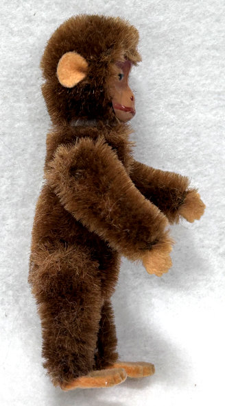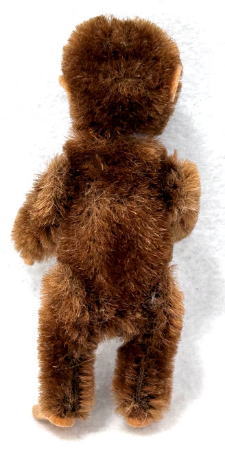This adorable little mohair monkey was made by Schuco around 1929. The feet, ears and hands are shaped felt and the face is metal with hand-painted features -- very rare and hard to find! The mohair on this one is all in mint condition with is also very hard to find ... these are a culinary delight to moths and many over the years have extreme loss to the hair. This one is like the day it came from the factory. He is fully jointed and can be posed. The head lifts off to expose a hidden glass perfume bottle with and old cork stopper still inside. The entire bottle can be removed from the body. He has little felt ears, feet and hands which are also in like-new condition with no wear whatsoever. Great for display or even to use. Measures 3-1/2" tall. First time offered! It has been in my personal collection since 1999! (Click on pic for more photos.) |