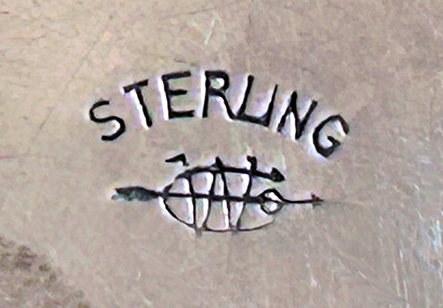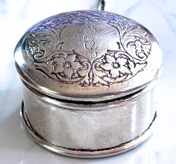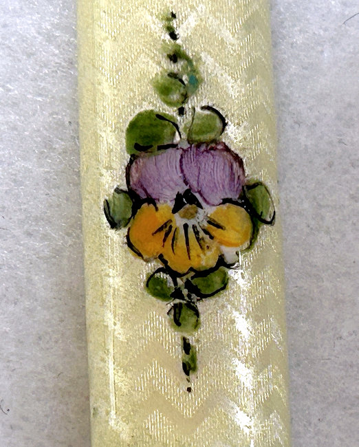 This is a delightful sterling silver tango compact whose manufacturer is unknown. The only marking I can find is a Sterling stamp in the rim of the base (I could not get a clear enough photo of it to share). The enamel guilloche with the hand-painted roses is done with a white center and a pink border. The designs in the guilloche are exquisite! The back of the compact is plain silver with the monogram "EH" engraved. Inside the base is empty and would have held loose powder and a puff. The mirror which was in the lid is no longer there but would be easily replaced. The finger ring is a plain band and the links have several bends which I don't believe are original but one never knows. Compact measures 1-1/2" diameter x 1/2" high (not counting slightly domed top). (Click on pic for more photos.) |