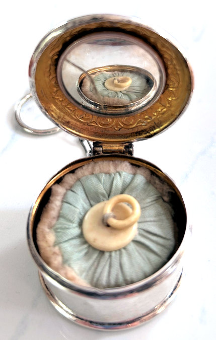 This is a sweet little compact on a finger ring chain made by R. Blackinton.It is oval in shape and has a beautiful center vignette of pink roses in full bloom on an ivory background. Surrounding this is a border of beautiful baby blue enamel guilloche. When the compact is opened, it has a set-in mirror in the lid which shows considerable silver loss around the edges; however, this is not a beveled mirror so it could be easily replaced. In the base is an original puff with a sweet blue bow on it and beneath it a removable powder pat, original to the piece as it is marked Blackinton on the bottom (see pics). It is in excellent condition! Measures 2-1/4" long x 1-1/4" wide x 1/2" deep. (Click on pic for more photos.) |
