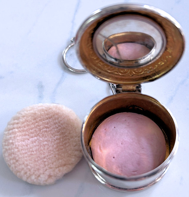 This is a darling little compact with finger ring by G. H. French Co. in sterling silver. The lid is a pretty candy pink enamel guilloche while the interior is fitted with a mirror in the lid and a cute original ruched lambswool puff with tiny finger ring in celluloid. It measures 1-1/2" diameter and is in excellent condition. (Click on pic for more photos.) |
