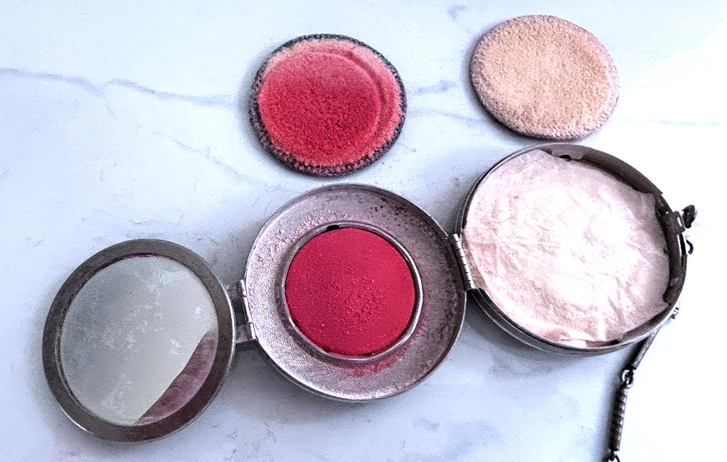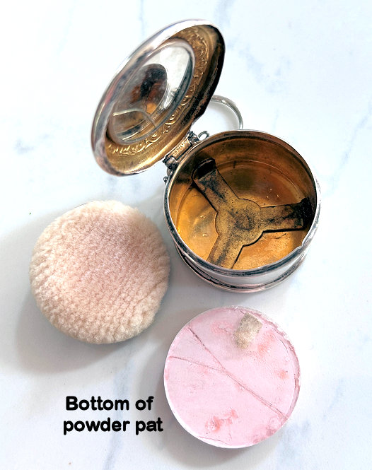 I have had this lovely tango in my own collection for several years and I hate to part with it. It is not perfect but because it is so unique and pretty, I had to have it. The color is a deeper Williamsburg blue with pink roses ... but what makes this stand out is that BOTH sides of the compact AND the lipstick have pink roses. I have never seen this before on a tango. The backs are usually plain. And the chain that connects the pieces is also blue enamel and these are near perfect. There is a wee bit of damage to the one end cap of the lipstick and the compact has damage near the hinge (worst area pictured) and the clasp on the rim. Both the top and bottom, however, are perfect. The interior has a crescent-shaped mirror with rouge pot on one side and a unique patented powder pat on the other side which is dated 1917. What appears to be an original puff is still inside. The piece is marked "Sterling" on the inside rim. Compact measures 2" diameter and lipstick is 2-1/8" long. (Click on pic for more photos.) |