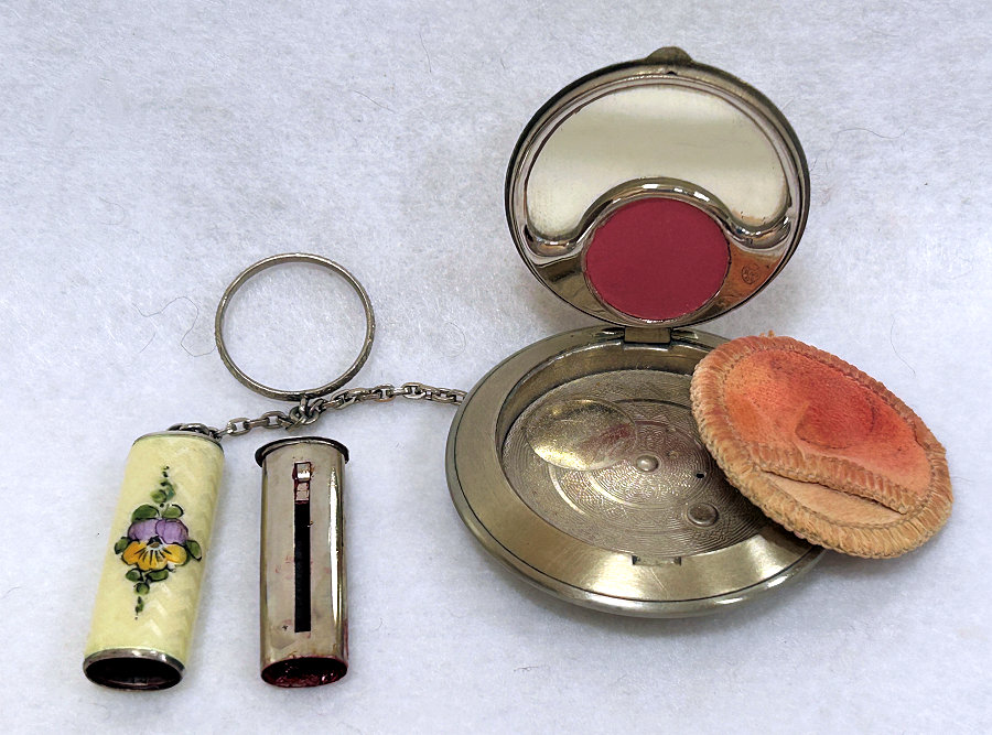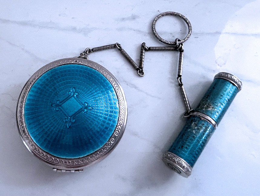 This is quite a pretty double enamel guilloche tango by an unknown maker with a blue vignette of a rose on the front surrounded by a gold gilt border and two blue flowers above and below. The back of the compact is a plain aqua enamel guilloche. The enameling covers the entire surface to the edges making it quite large. The lipstick case is unusual in that it has a removable lipstick inside. Also the enameling on the case is not guilloche but does have a blue flower on it. Inside the compact is a rotating powder sifter on one side and a flip-up metallic mirror with rouge pot and puff beneath. The enameling on the compact has surface scuffs and the lipstick case has a few miniscule flakes. The mirror inside has visible rust pitting on both sides ... priced below my cost because of these issues.... I had paid $400 for it 8 years ago. It is not marked sterling even though I was told it was when I bought it. Compact measures almost 2-1/4" diameter and lipstick case is a bit over 2" long. (Click on pic for more photos.) |