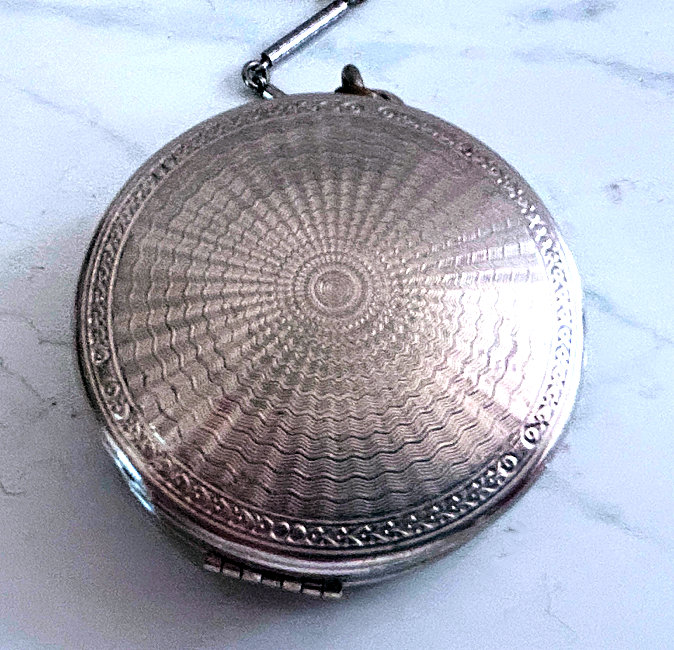 Here is a very pretty unmarked tango compact done in full enamel guilloche on both front and back. The front features a creamy ivory center with blue border in which four pink roses have been hand-painted. The back is solid blue enamel guilloche in a radiating wavy design. The interior of the compact features a beautifully engine-turned rotating powder sifter in the base; in the lid is a metallic mirror which opens to reveal a rouge pot (no rouge). I have not been able to find a maker's mark although it could be beneath the sifter which I cannot remove. The finger ring and chain link bars are all richly embossed. Overall it is in excellent condition with no scratches or damage that I can see, only superficial scuffs visible when held to light or with a loupe. It is a wonderful piece and larger than the average compact ... it measures 2-1/4" diameter. (Click on pic for more photos.) |