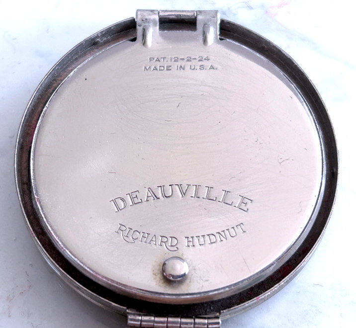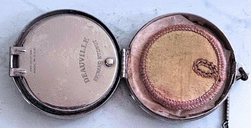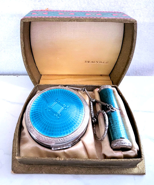 This is such a beautiful tango compact/lipstick in its original presentation box. Patented December 2, 1924, it is the Deauville design made by Richard Hudnut. Even though it has been stored in this pretty silk-covered box, this tango has been lovingly used over its 100+ years! Photos will show condition, but I will point out a faint hairline in the lid of the compact. The lipstick shows several areas of enamel loss, but still displays nicely from one side. The lipstick case has a blue "D" on one end and still has lipstick inside. The compact has a mirror powder pat on one side and a covered rouge pot and mirror on the other. There are two puffs inside although they are different colors so I am not sure if either is original or replacements. The cover on the rouge pot shows the date, Made in USA, Deauville, and Richard Hudnut. The chain and ring have embossed designs on them as does the edge of the compact and lipstick. Back of compact has damascened designs. Compact measures 2-1/8" diameter x 3/4" deep. Lipstick is 2-1/4" long. Box measures 4-1/4" x 3-1/8" x 1-1/2" high. (Click on pic for more photos.) |