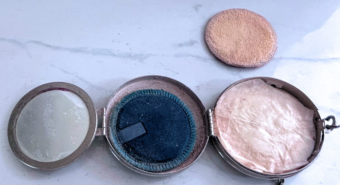 This rare double tango compact has been a prize in my collection for many, many years and I am ready to say good-bye to it. In all my years of collecting, I have never seen another like it. I have no idea of the manufacturer as there are no marks on it that I can find. It is done in plain purple enameling on the outer case of the compact and the matching lipstick but the two compact covers are a lighter purple enamel guilloche with a darker purple flower in the center of each and garlands with tiny yellow flowers. Each compact opens to reveal a mirror in the lids ... the left side has a puff (not original) with rotating powder sifter and the right side has an original puff with rouge pat beneath. The lipstick opens and has a thumbscrew at the base to push the lipstick up but I cannot get it to move and don't want to force it. The lids are both in excellent condition. There are some very teeny fleabites in the purple enameling on the lipstick and some edge wear (again, very faint) on the sides of the compact but not noticeable unless you are really looking closely. Overall I would rate it a 9+ out of 10 and considering its rarity, totally acceptable. Compacts measure a bit over 3" across x 1-5/8" high. Lipstick is 2" long x almost 1/2" diameter. (Click on pic for more photos.) |