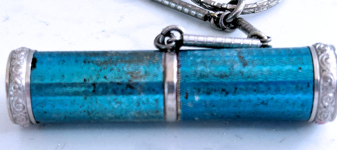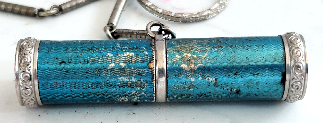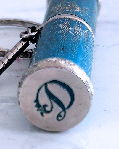 This is such a pretty little vanity case in sterling silver with a robin's egg blue enamel guilloche lid on the compact portion. The little silver tassel is just adorable! Inside the lid is a mirror with some silver loss around the edges. The removable ring handle is not marked sterling that I can find so it may be a later addition although the design is very similar to that on the vanity. Overall it is in excellent condition. Case portion measures 2-1/2" high (not counting little tassel) x 1-3/4" wide. Overall from top ring to bottom of tassel is 7-1/2". It is hallmarked inside but I cannot make out the manufacturer. |