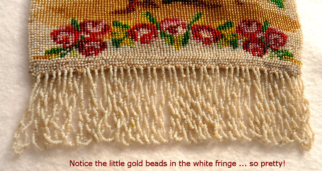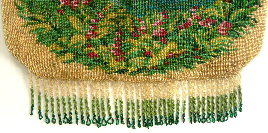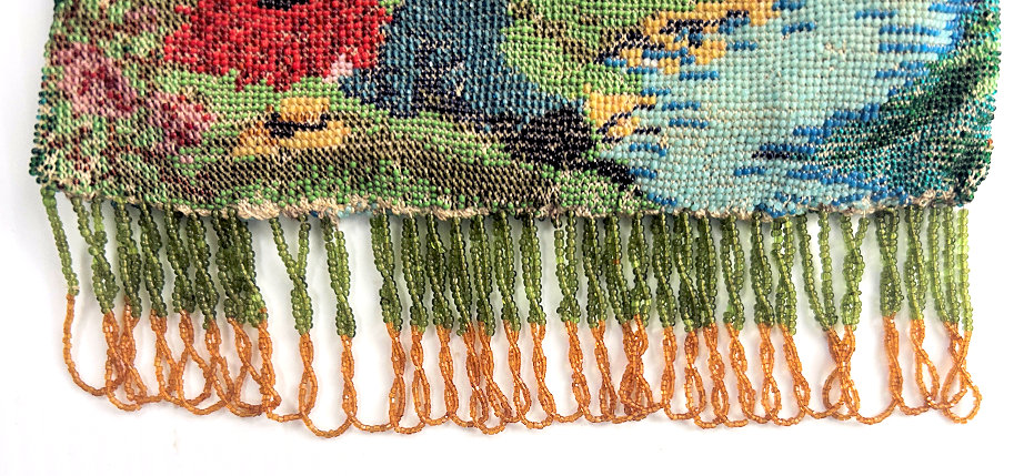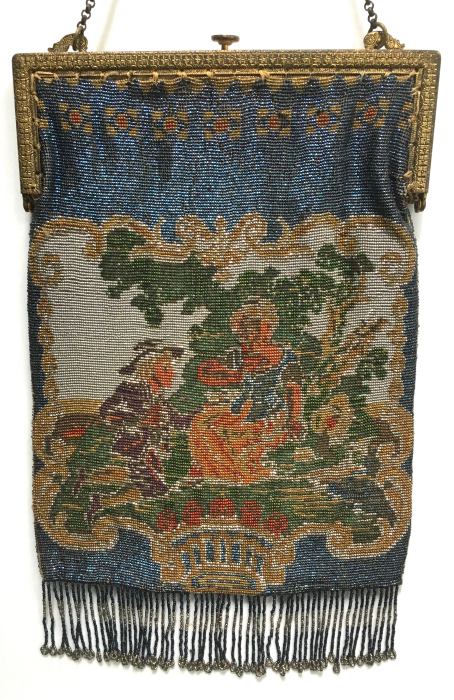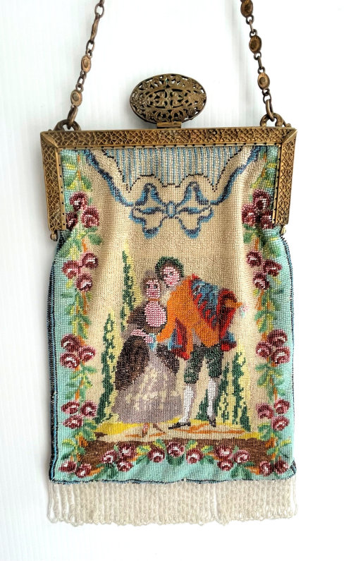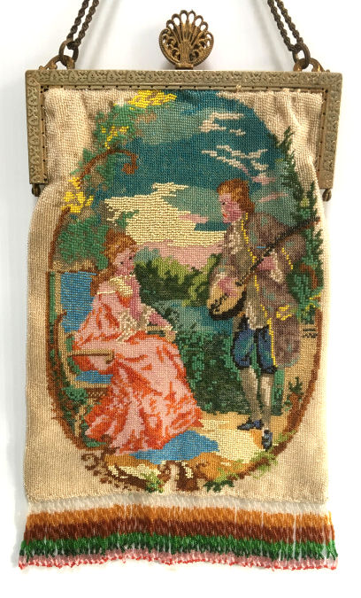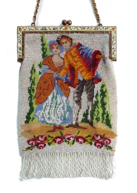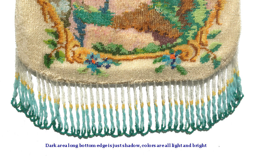 This beautiful figural micro-beaded purse features a romantic couple with the gent serenading his lady fair with a mandalin. There is a lovely castle in the background. The frame on this is very ornate with embossed roses on both sides and jewels encrusted on the front. The closure is a snap and the chainlink handle is also very ornatel with embossed rosettes. The fringe also reflects the colors of the purse in multi-color changes in twisted loops. The inside retains its original muslin lining with a ruched pocket and braided trim. Excellent condition throughout. Measures 7" wide at the frame, 7-1/2" wide at the bottom and almost 11" long overall from clasp to bottom of fringe. The chainlink handle is 7-1/2" long. (Click on pic for more photos.) |