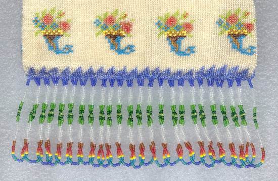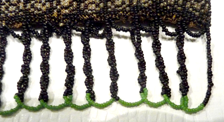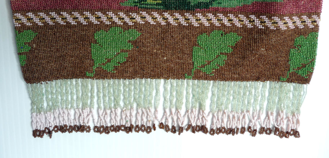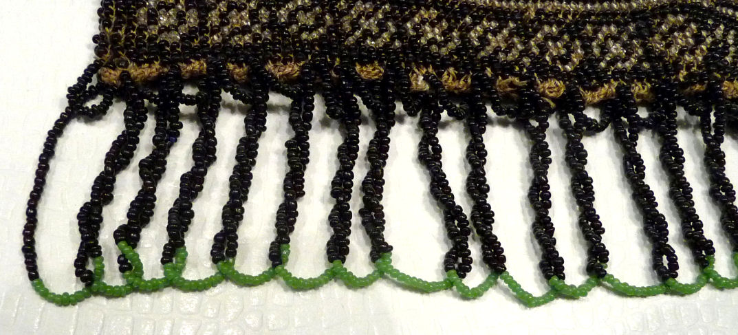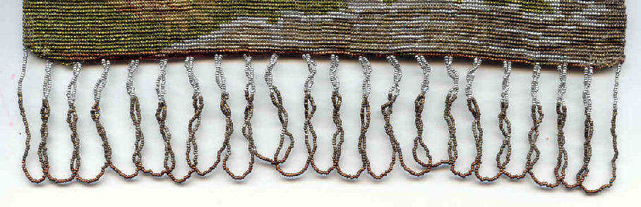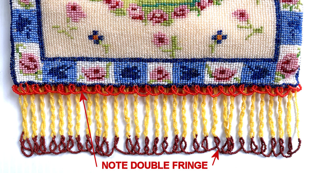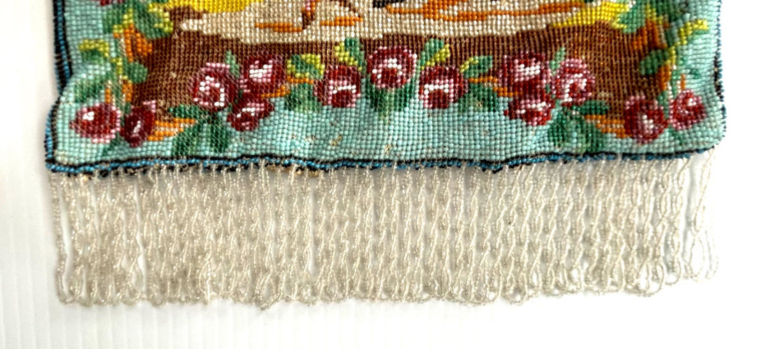 This beautiful figural micro-beaded purse features a romantic couple with the gent serenading his lady fair with a mandalin. There is a lovely castle in the background. The frame on this is very ornate with embossed roses on both sides and jewels encrusted on the front. The closure is a snap and the chainlink handle is also very ornatel with embossed rosettes. The fringe also reflects the colors of the purse in multi-color changes in twisted loops. The inside retains its original muslin lining with a ruched pocket and braided trim. Excellent condition throughout. Measures 7" wide at the frame, 7-1/2" wide at the bottom and almost 11" long overall from clasp to bottom of fringe. The chainlink handle is 7-1/2" long. (Click on pic for more photos.) |
