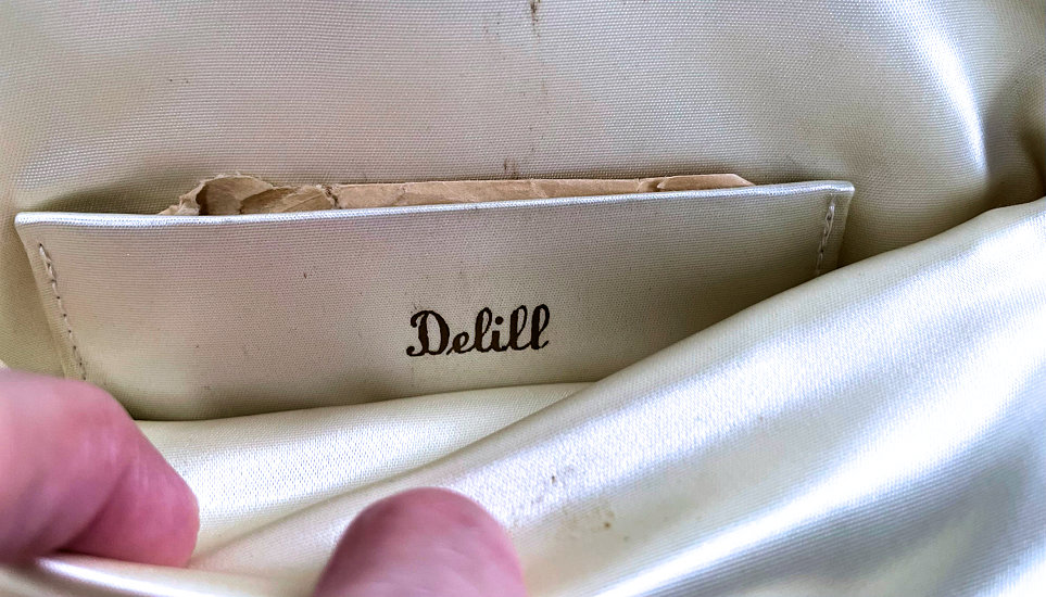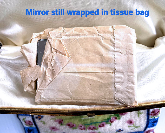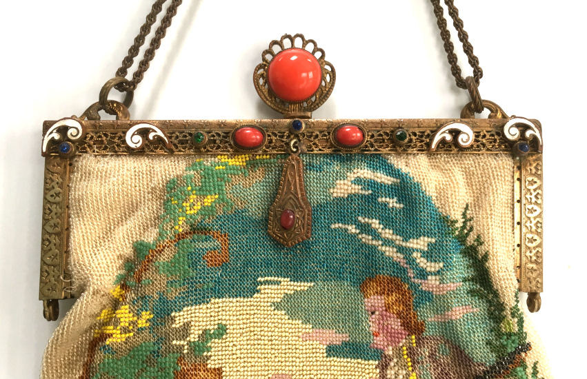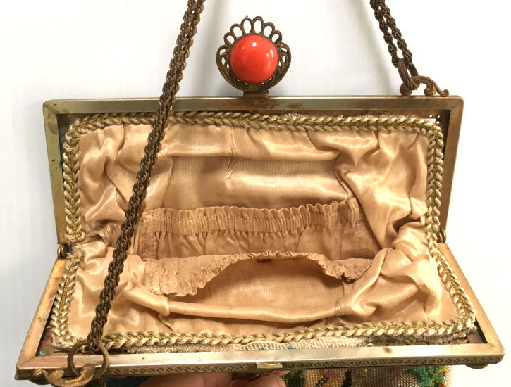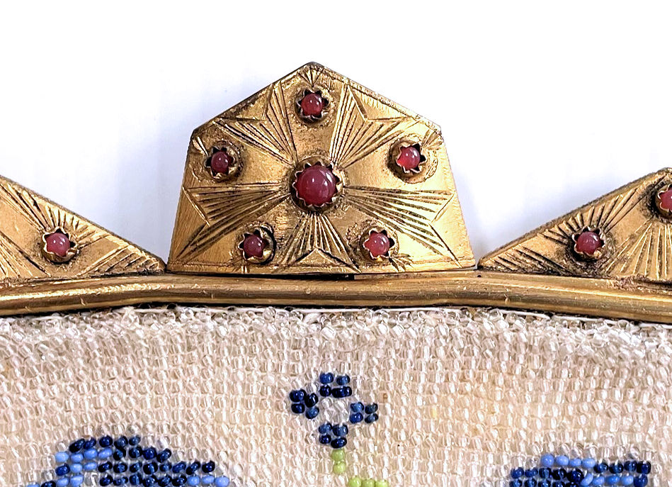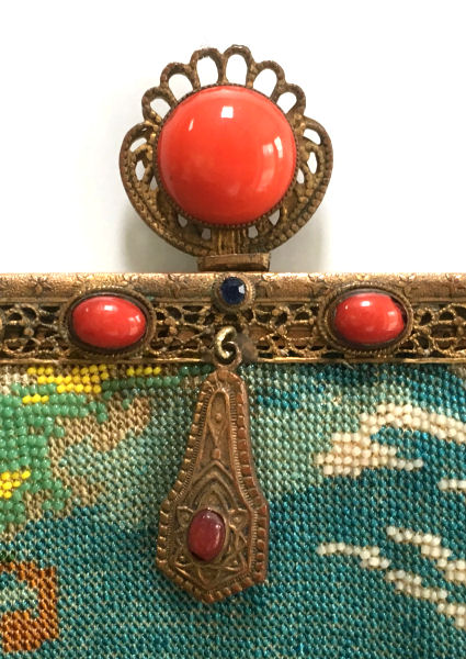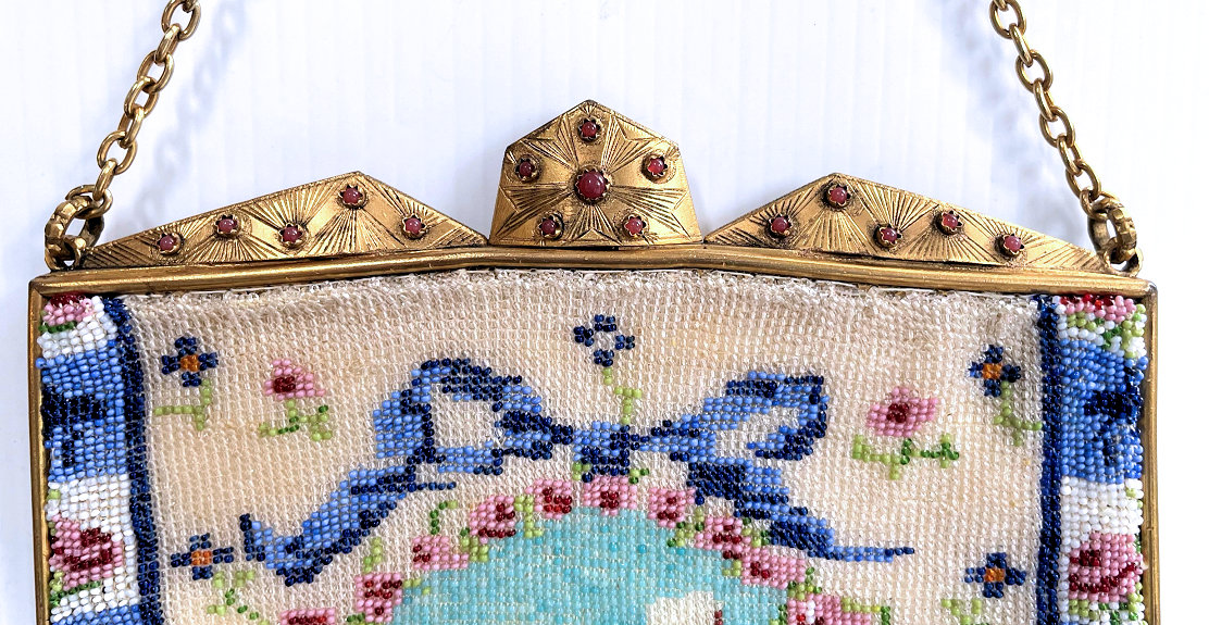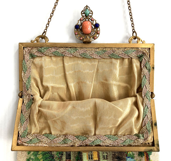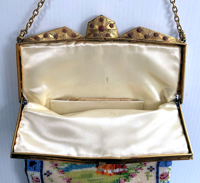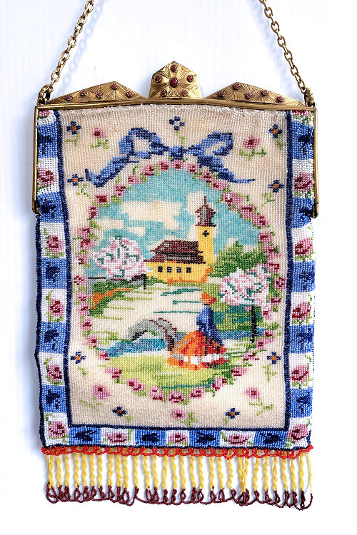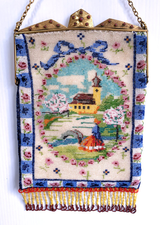 This gorgeous micro-beaded purse was made by the famed Delill company (read more about them here). It is one of the rarest beaded purses they ever made as scenics and figurals are almost non-existent. Probably one of their earliest creations dating from the very early 1940's, it depicts a young woman in her Sunday best on her way to church. There is an arched bridge over a stream in the foreground and cherry blossom trees in the background. All of this is surrounded by a garland of pink roses with a blue ribbon at the top. And the edges are done in alternating squares of blue and white squares with pink roses. The frame is absolutely fantastic being jeweled on both sides with carnelians. Each gemstone is bezel set in little flower-shaped bezels -- see close-ups. Both sides are identical and either can be used as the front. The fringe is also exceptional with a double layer ... again, something you rarely find. Inside is lined in original ivory satin with the Delill name on a small pocket which holds an original mirror still wrapped in the original tissue bag. It is truly a phenomenal purse and in excellent condition! Measures approximately 6-3/'4" wide x 11" long overall not counting chain. (Click on pic for more photos.) |