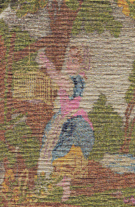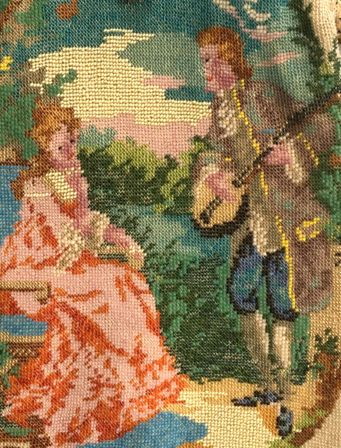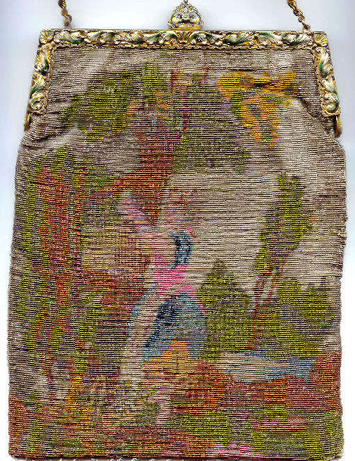Here is a truly stunning purse featuring a variant of Nicolas Lancret's painting "The Serenade" done in 1740. It features a beautiful young lady seated on a fancy chair in a garden with a young man serenading her. The picture is done in a vignette style with a "frame" around it almost as if you are looking through a window into the garden. There is a lake in the background and clouds in the sky. The micro-beads are done in opaque and gold iridescent beads so that the scene sparkles (her chair and the gent's mandolin for example). Both sides of the purse have he same scene and it is finished off at the bottom with multi-colored fringe that picks up the colors from the purse. The frame is absolutely spectacular with a high crown stand-up jeweled clasp and a matching jeweled drop pendant. There are also seven addtional smaller jewels across the top of the frame. Interior retains the original lining with two ruched pockets as well. This entire purse is in excellent condition with no apologies whatsoever. Measures 6-1/2" wide at frame x 12" long from top of clasp to bottom of fringe. Jeweled clasp is 1-1/4" high. First time offered! (Click on pic for more photos.) |