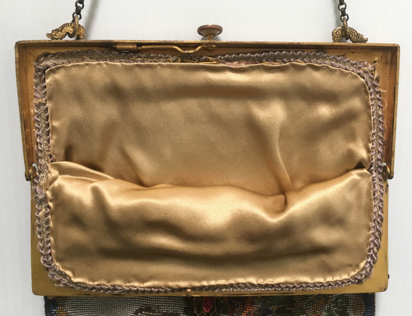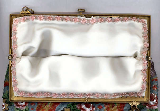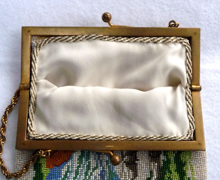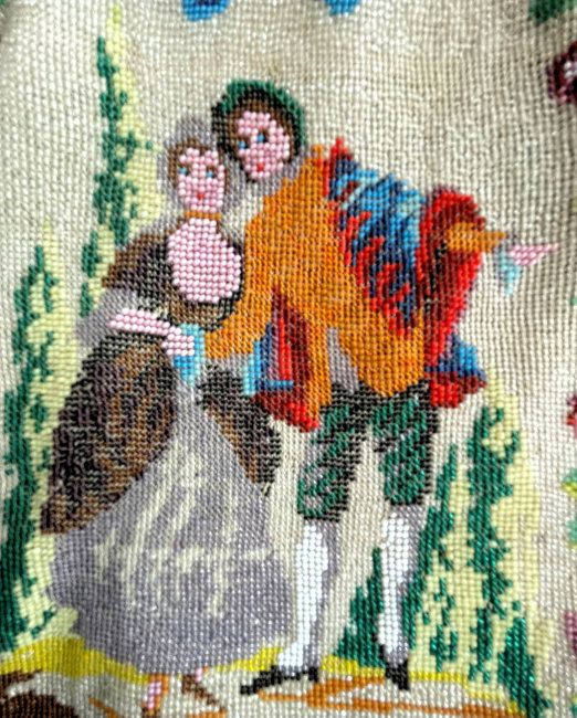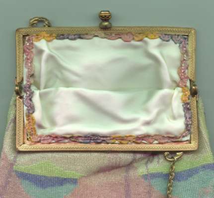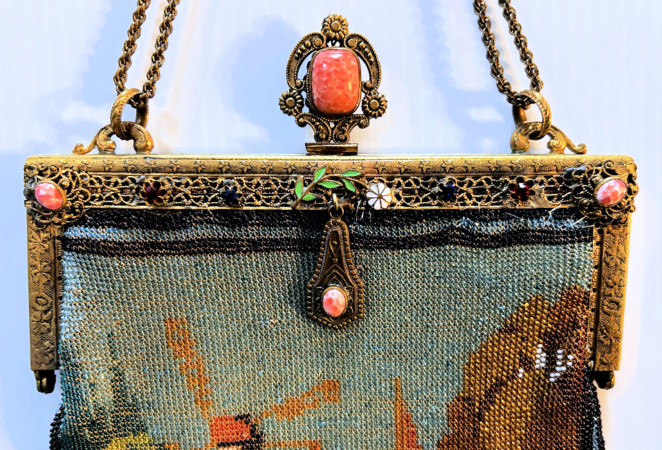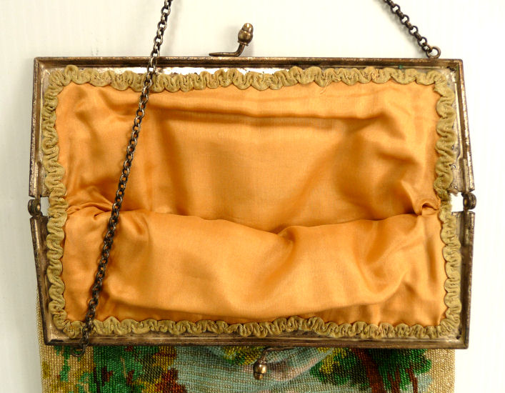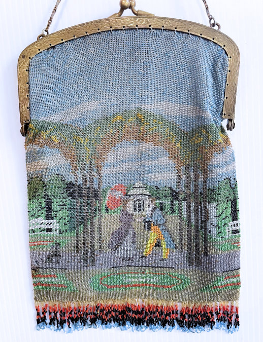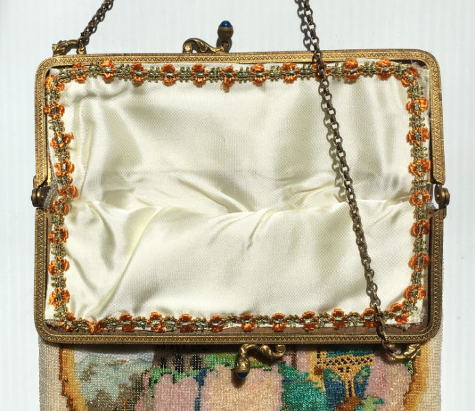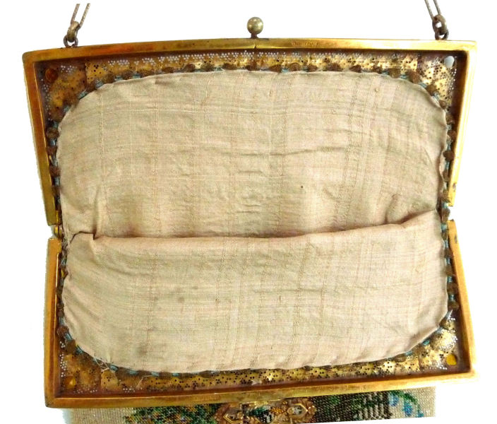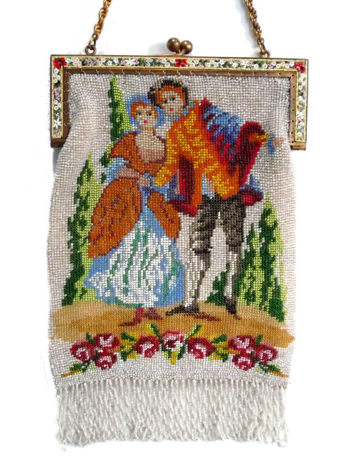 This beauty has long been in my collection and features a full length scene of a courting couple in fancy garb out for a stroll in a lovely garden. The colors are bright and bold on a creamy white background. The fringe is done in the same color as the background with tiny gold beads interspersed for added sparkle. The frame is absolutely spectacular and is done in hand-set tiny mosaic pieces in flowers and leaves. Both sides of the purse are identical but the frame colors are slightly different on each side so you can display it whichever way appeals most to you. Be sure to look at all of the pictures of this stunning purse and you will fall in love with it as I did. The interior is newly lined and the purse is in excellent condition throughout with no damage whatsoever. It is a true beauty! Measures 5-1/2" wide at frame x 9" long from clasp to bottom of fringe. First time offered! (Click on pic for more photos.) |