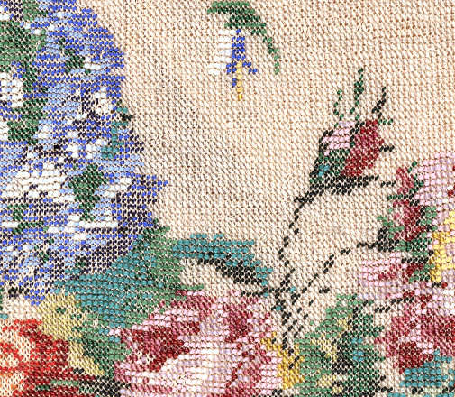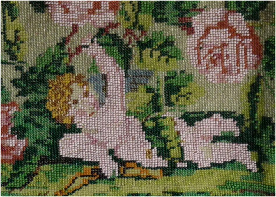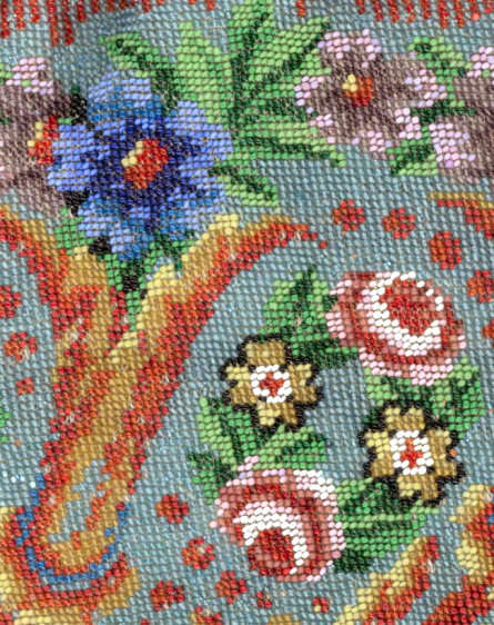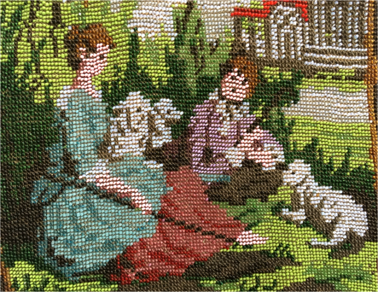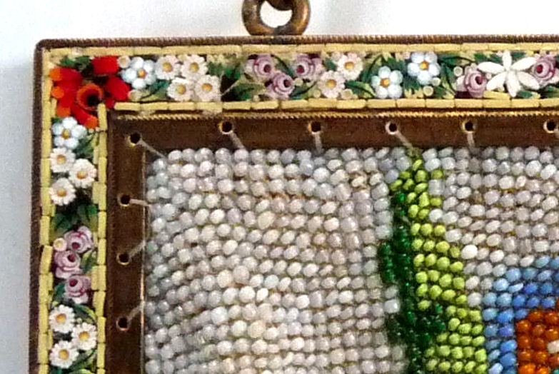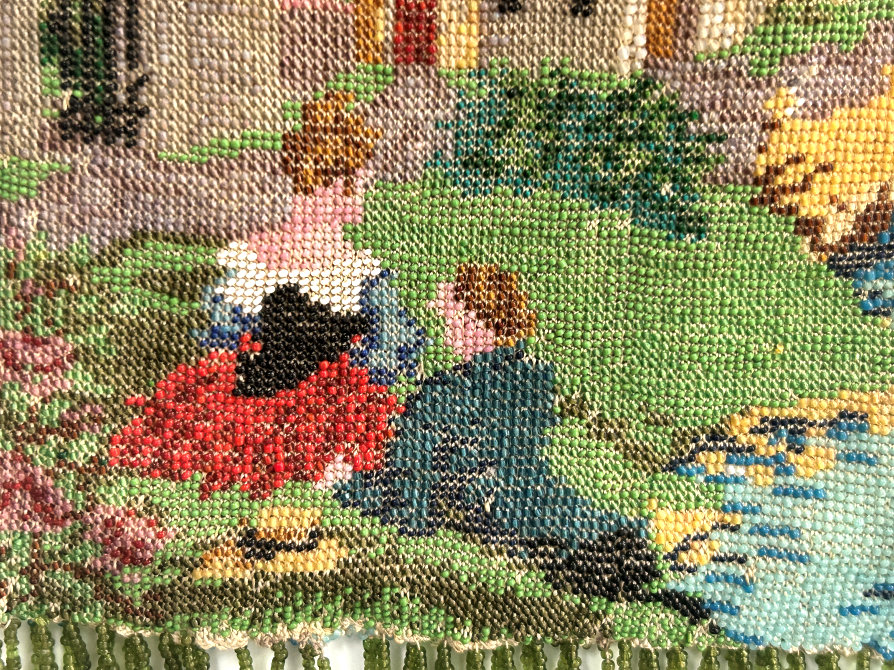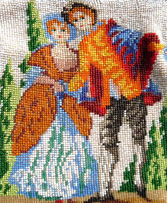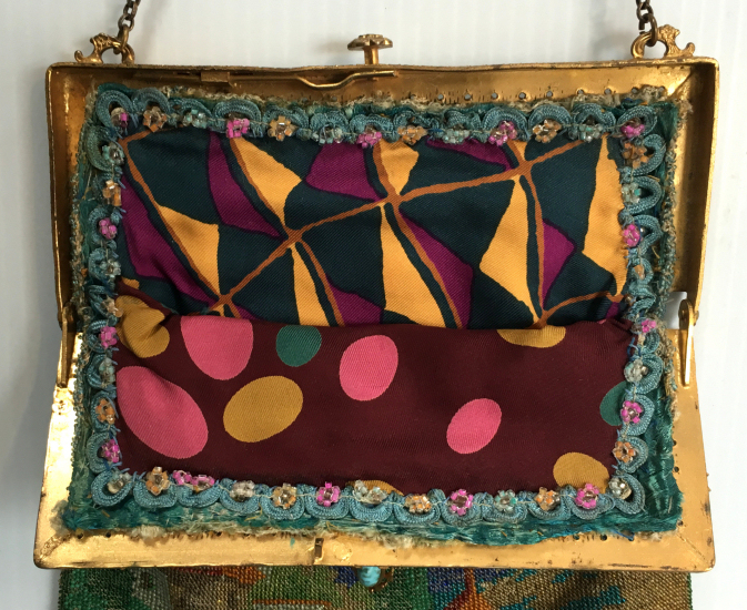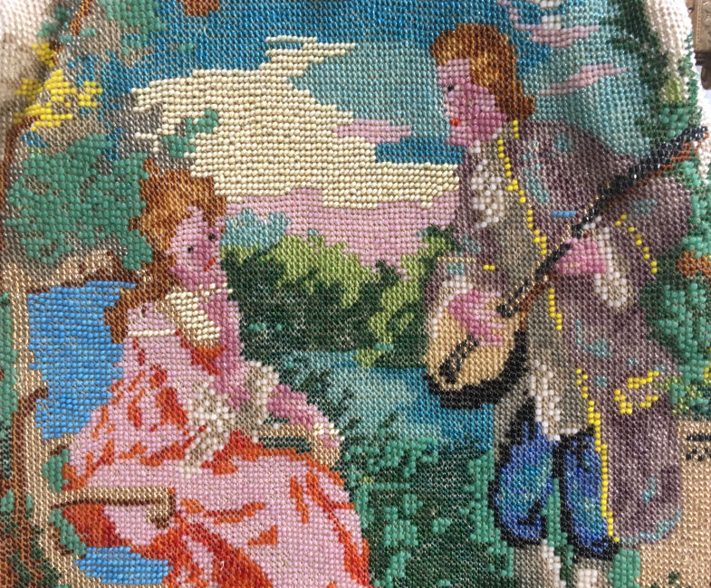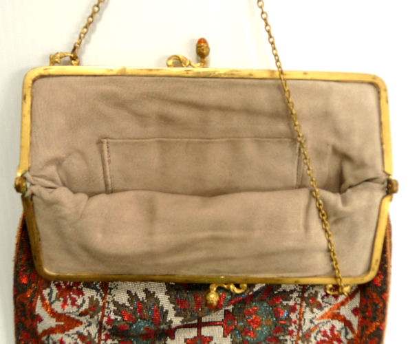 This beauty has long been in my collection and features a full length scene of a courting couple in fancy garb out for a stroll in a lovely garden. The colors are bright and bold on a creamy white background. The fringe is done in the same color as the background with tiny gold beads interspersed for added sparkle. The frame is absolutely spectacular and is done in hand-set tiny mosaic pieces in flowers and leaves. Both sides of the purse are identical but the frame colors are slightly different on each side so you can display it whichever way appeals most to you. Be sure to look at all of the pictures of this stunning purse and you will fall in love with it as I did. The interior is newly lined and the purse is in excellent condition throughout with no damage whatsoever. It is a true beauty! Measures 5-1/2" wide at frame x 9" long from clasp to bottom of fringe. First time offered! (Click on pic for more photos.) |