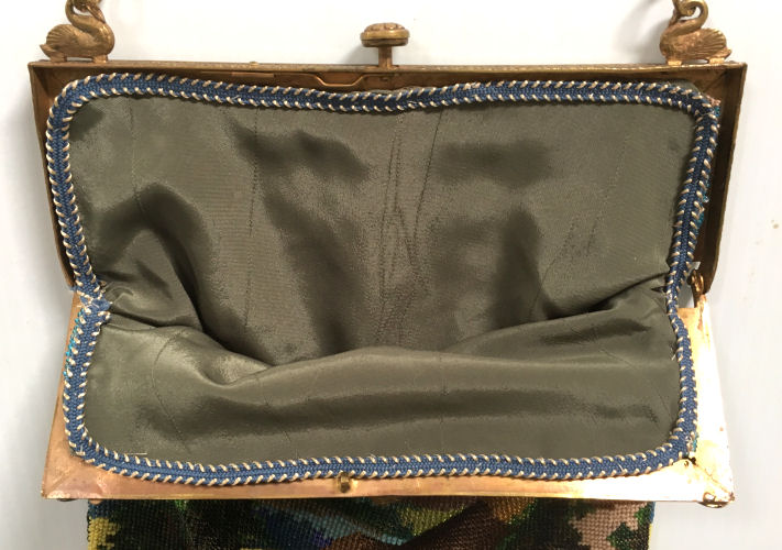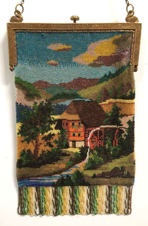 This lovely scenic micro-beaded purse depicts a tranquil setting of an old mill nestled in the mountains beneath a blue sky. It is so pretty! The purse is set off with a gorgeous jeweled frame with five malachite jewels and branches of enameled faux emeralds on either corner. The frame also has two swans to hold the chainlink handle and a swallow on the drop pendant (a design I have never seen before). There are also enameled white petals on either side of the center jewel. The left top corner malachite cabochon does have a chip in it but as it is original and I do not have a replacement, I am leaving it as found. The fringe is stunning in several different colors picked up from the purse in tightly intertwined twisted loops. The interior is finished in a dark green silk with braided trim. With the exception of the chipped jewel, this purse is in excellent condition throughout. Measures 6-1/2" wide x 11" long from top of clasp to bottom of purse. First time offered! (Click on pic for more photos.) |