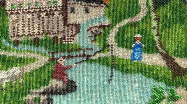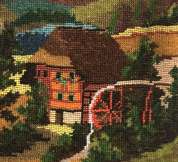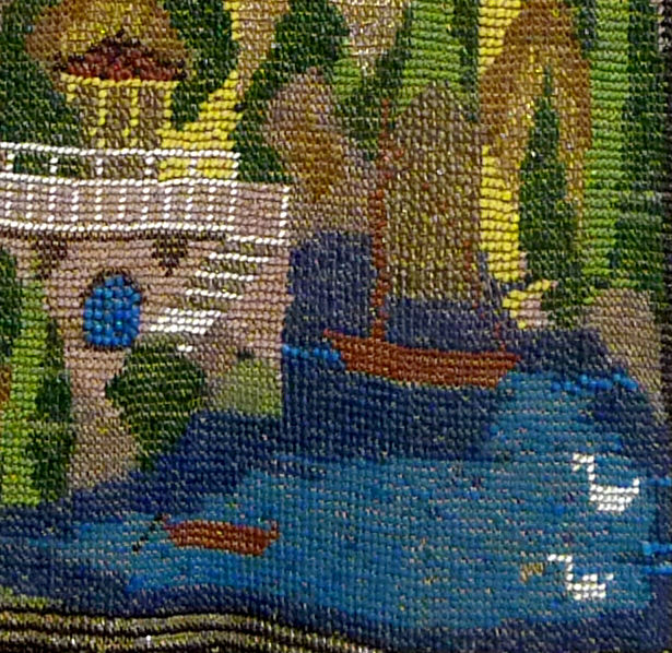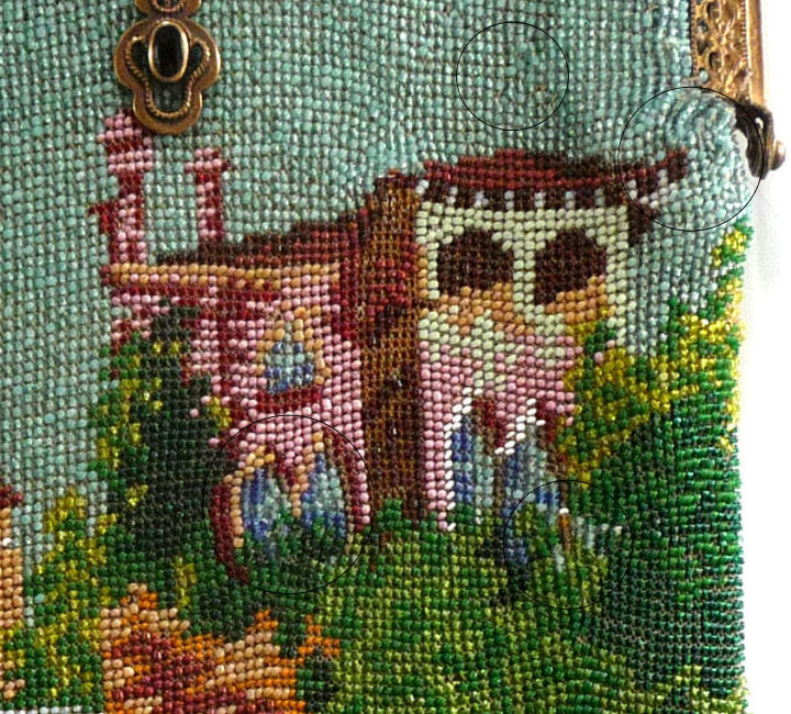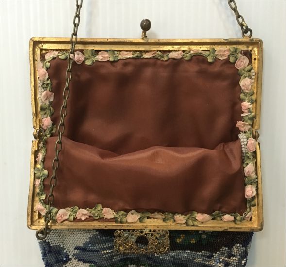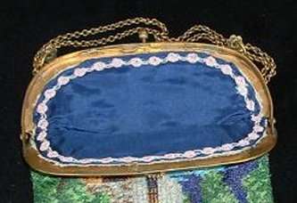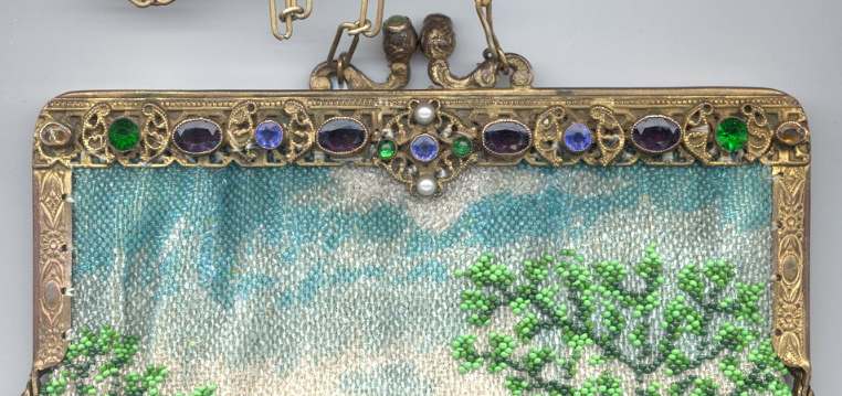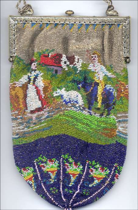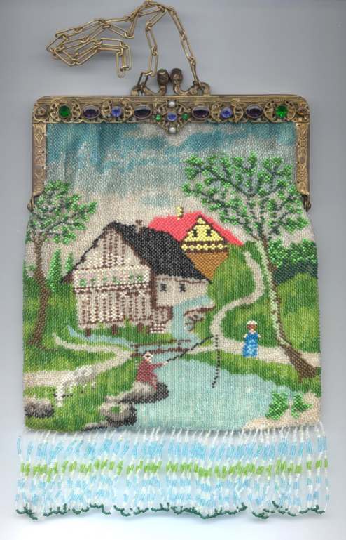 I just love the peaceful tranquility of this micro-beaded purse. There is a house in the background with a mill in front and a waterwheel spilling into a stream. You can see a bridge and a path winding along both sides. There is a fisherman perched on a rock on one side with a sheep (or horse) grazing in the grass behind him. Across the stream is a lady, probably his wife, beckoning to him. Trees are in full bloom, and the water seems to flow right into the fringe in a cascade of colors. Now let your eyes stray to the frame on this beauty ... it is set with cut jewels in various colors as well as jewels set in the clasp. Interior is lined in green silk with French ribbon rosebud trim. The purse is in fantastic condition with no bead loss that I can see. It is really exquisite! Measures 6" wide x 9-1/2" long to bottom of fringe. Previously listed at $2,650. (Click on pic for more photos.) |