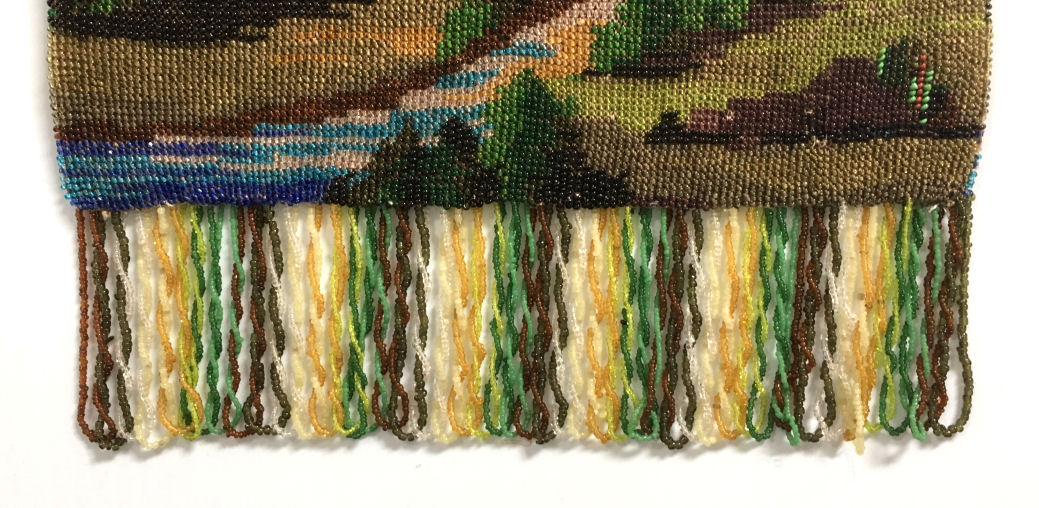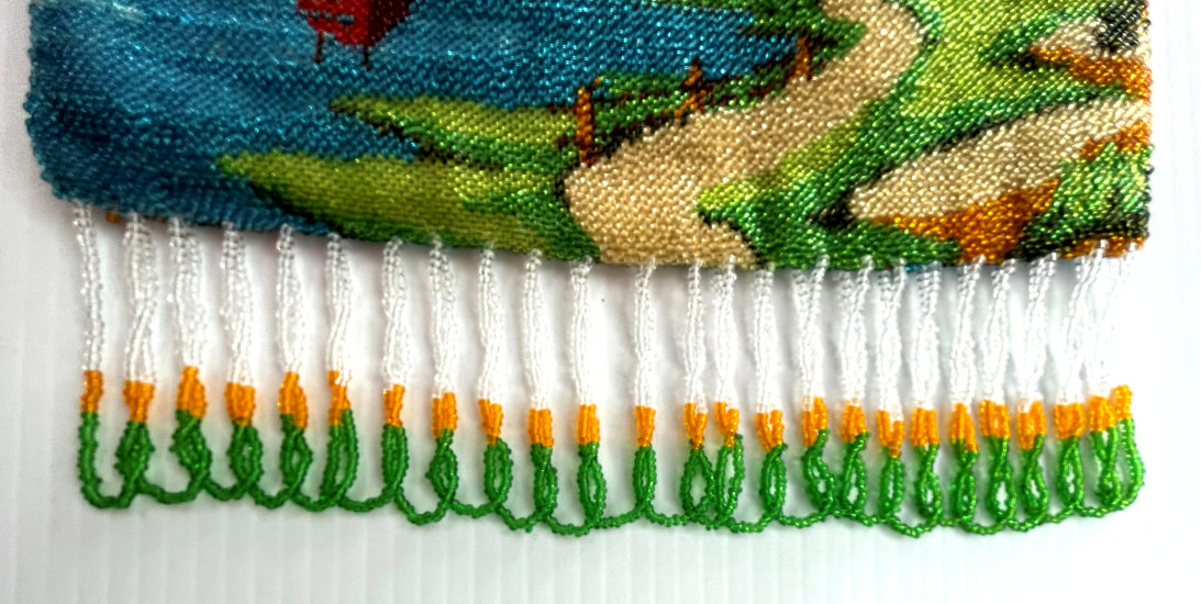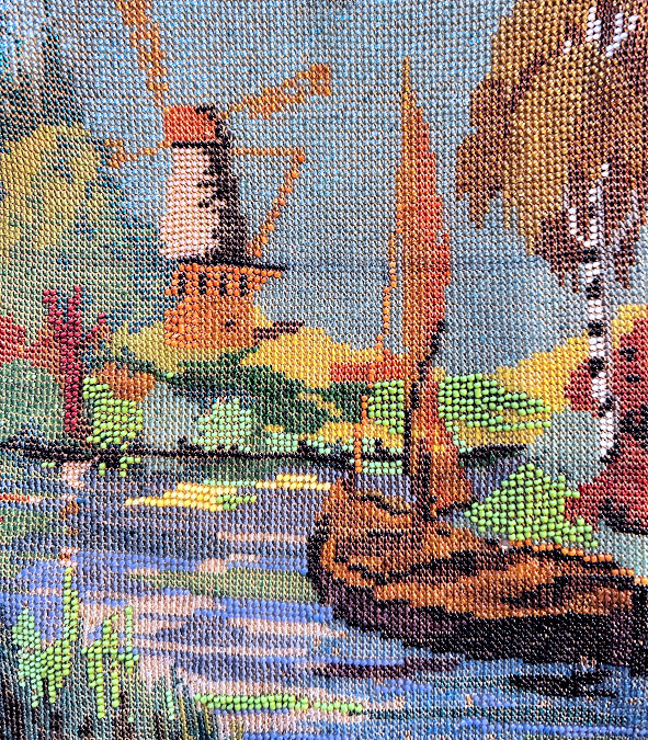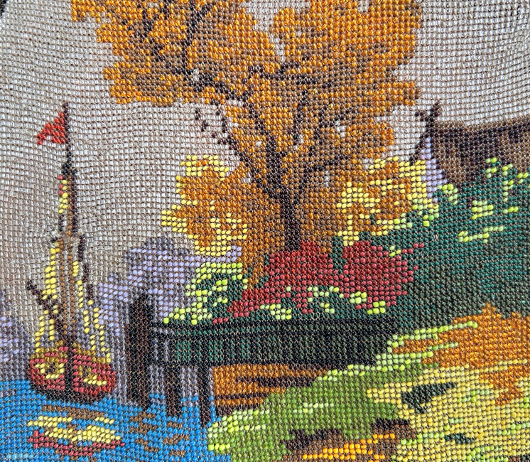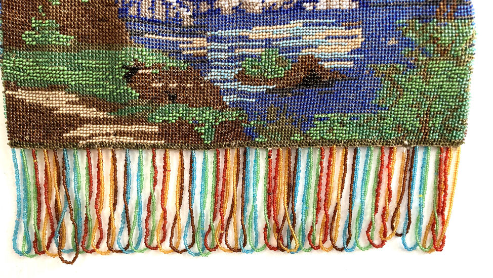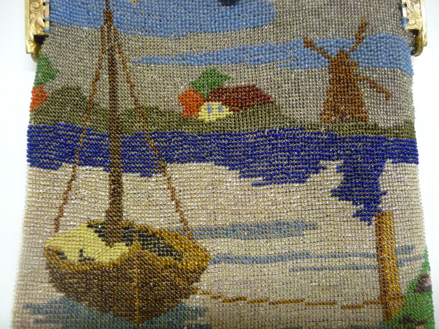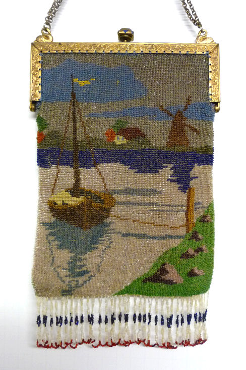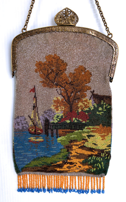 This gorgeous scenic micro-beaded purse features a tall-masted ship moored along a dock with autumn leafed trees in the background. The frame on this is extremely ornate with myriad jewels in colors that mirror those in the purse. The drop pendant and crown clasp are also jeweled and it makes for a stunning display. The fringe also reflects the colors of the purse in twisted loops. The inside has been relined with silk dupioni fabric to give it a little more support than a lighter weight silk. Overall the purse is in very good condition with no missing beads that I can see. Measures 6-1/8" wide at the frame, 6-1/2" wide at the bottom and almost 12" long overall from clasp to bottom of fringe. (Click on pic for more photos.) |