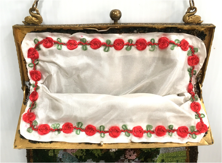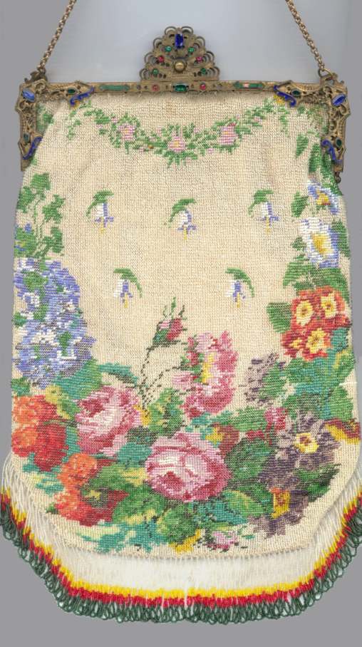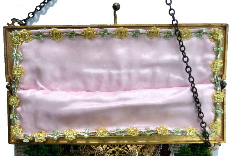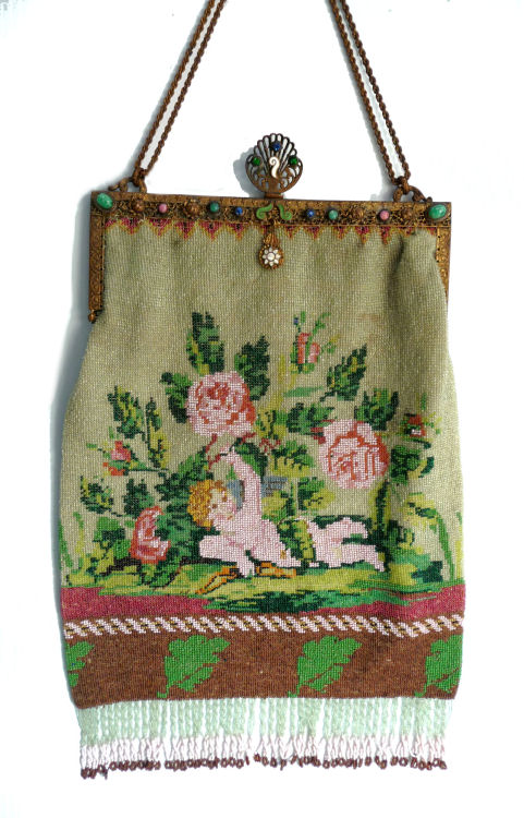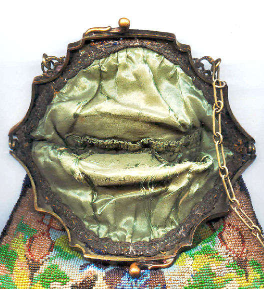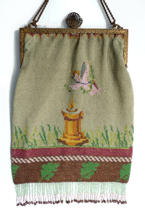 This is a very rare, early, beautiful micro-beaded purse featuring a reclining angel in a garden of roses on the front with his bow in front of him while the back features a completely different view of same angel flying above a garden fountain. The colors are bright and vivid greens and pinks while the background beads of the purse are the palest of pale greens. The bottom of the purse has a dividing garland of pink and gold beads in a rope design separating a brown portion with large green leaves. This design would date this purse to the mid to early 1800's in my opinion. The jeweled frame (a later addition as the original frame was plain) boasts malachite, sapphire, emerald, and coral gemstones among filigreed enameled brass. The stand-up jeweled clasp is especially striking. The fringe is intricately done in interlocking twisted loops in pale green and pink with tiny brown loops at the very tips. Interior is lined in pale green silk with rosebud trim. Due to age, there may be a missing bead here or there but if there are, they are totally not discernible and not significant in any way. There are no holes or damage. On the back of the purse, up near the frame, there are two very old repairs that are very small and well done and only noticeable upon close inspection. There are also a few age spots that are not bad at all and do not detract from the appearance in any way. Check out all the pictures to see condition. This purse can be display from either side and looks like two totally different purses! This is a large purse measuring 7-1/8" wide at frame x 8-1/2" wide across the bottom x 13-1/4" long from clasp to bottom of fringe. First time offered! (Click on pic for more photos.) |