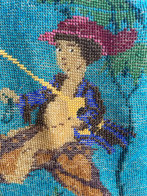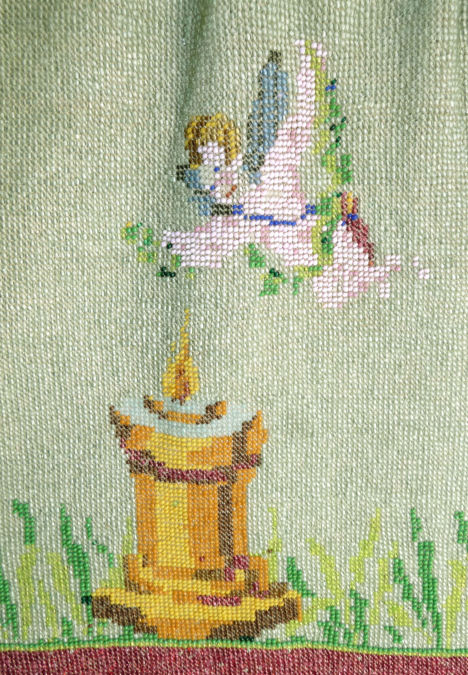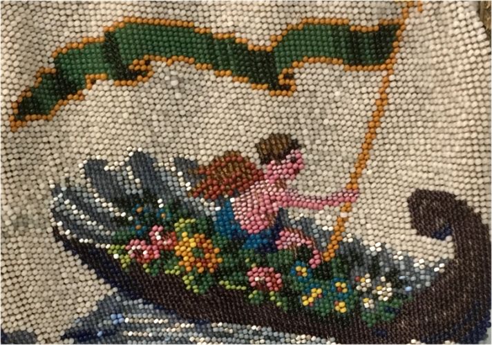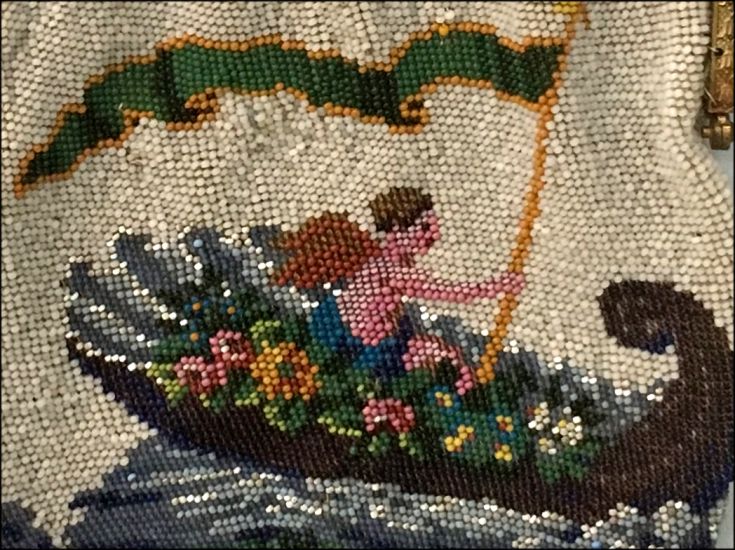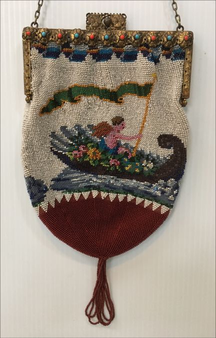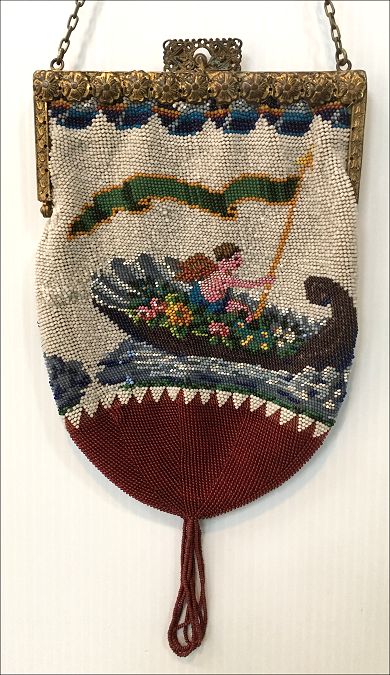 This late-1800's beaded purse features a banner-bearing angel in a flower bedecked gondola ... the bottom of the purse has the sawtooth border which is typical of the period. The purse is in excellent condition with some older restoration and some newer professional repairs. The frame is very beautiful with intricate workmanship on both sides. The front side has eleven jewels which I believe to be turquoise and coral. The inside is lined and trimmed with pretty ribbon roses. The bottom is finished off with a looped tassel. Measures 5-1/4" wide at frame x 7-1/2" long not counting the tassel which is another 2-1/2". First time offered! (Click on pic for more photos.) |