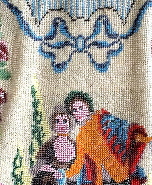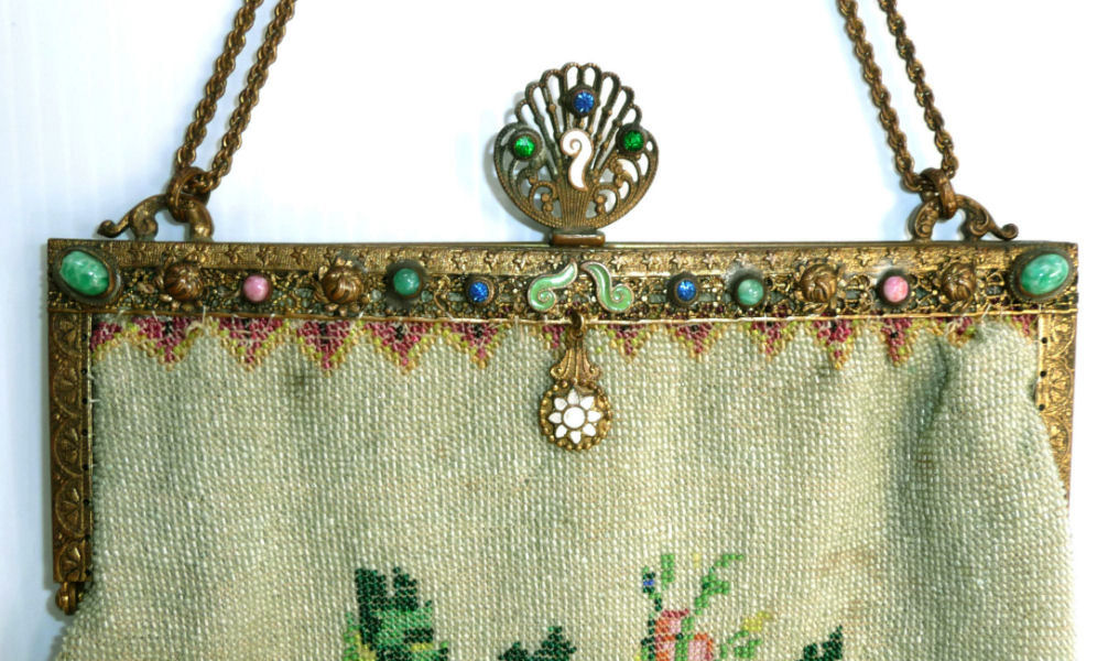 This purse would be a bit earlier than most that you see ... in fact, it was probably a reticule at the beginning of its existence in the latter 1800's. It was probably updated in the 20's when framed purses became popular and this jeweled frame was placed on it. This is only a deductive guess ... the frame could very well be original. The lovely design features a woman with a cow and a lad on a donkey with a sheep in between walking down a country lane with barn and farmouse in the background. The bottom portion of the purse is done in a deep cobalt blue with flowering cornucopias all around and finished in a pink and blue tassel with the same beads that were used in the purse. The frame is set with six jewels: 2 red, 2 blue, and 2 green. Interior has been relined at some point with navy blue satin. The front of the purse has one extremely tiny repair by the donkey's front leg, very well done and I found it by feel rather than sight. The back of the purse has two areas that have been mended: one in the sky and one in front of the donkey's head. These are very old repairs and are expertly done and not a detriment to such a lovely piece and are taken into account in pricing. Measures 6" wide at frame x 12" long from clasp to bottom of tassel. Previously listed at $1,699. (Click on pic for more photos.) |