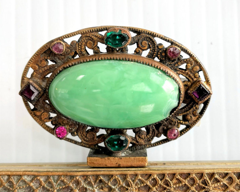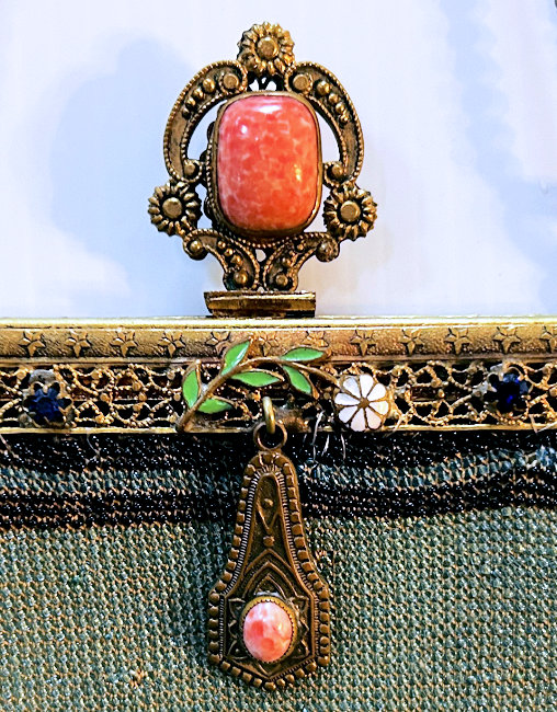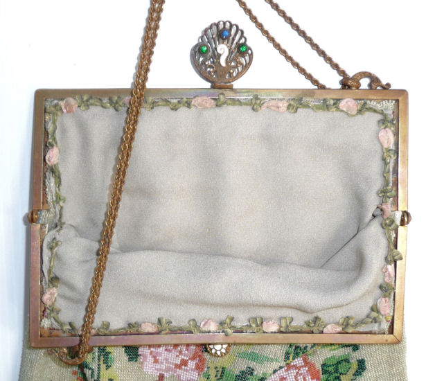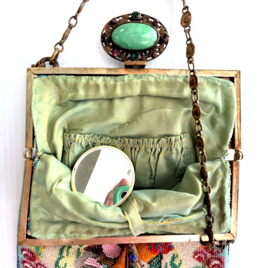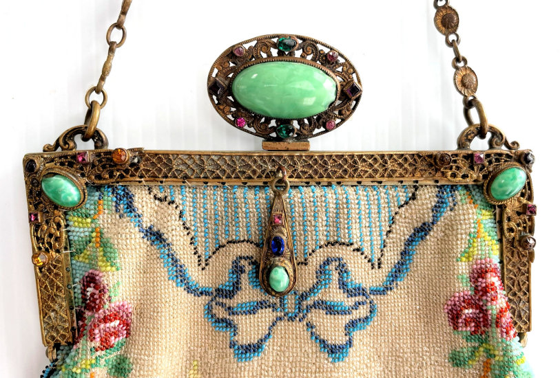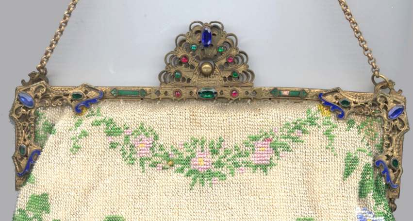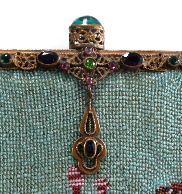 This gorgeous purse features a fancily dressed couple in a garden scene. The colors are bright and bold on a creamy white background surrounded by a border of aqua with pink and red roses. And the top has a blue ribbon which is so pretty. The fringe is done in the same color as the background. But what makes this purse killer is the fantastic jeweled frame! The clasp is one of the biggest malachite stones I have ever seen and it is surrounded by smaller gemstones in pink, emerald and amethyst. It even has a matching jeweled drop pendant with pink and sapphire and malachite gems! Both sides of the purse are identical but the jewels are only on the front side. The interior boasts the original lining with a ruched pocket and a little attached round mirror. The chainlink handle has really pretty embossed flowers in sunbursts. Be sure to look at all of the pictures of this stunning purse and you will fall in love with it as I did. The beadwork is in excellent condition. The jewels in the frame have a few chips on the malachite stones (top clasp and left corner one). Considering the rarity of the frame, it's not that big a deal to me. I just love it and how the stones pick up the colors from the purse. It is a true beauty! Measures 6" wide at frame x 7-1/4" wide at bottom x 12-1/4" long from clasp to bottom of fringe. First time offered! (Click on pic for more photos.) |