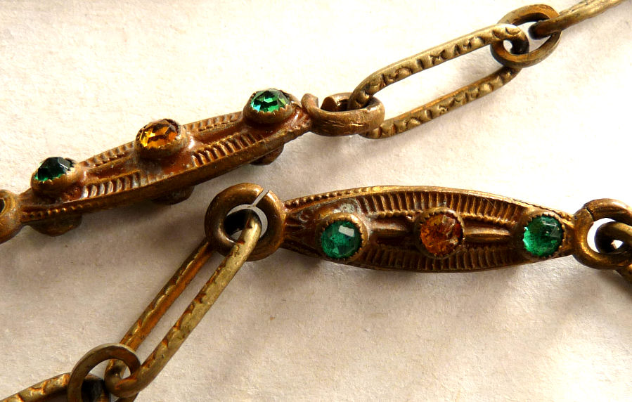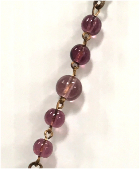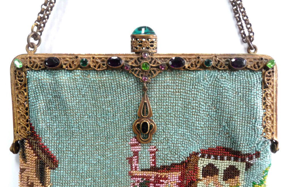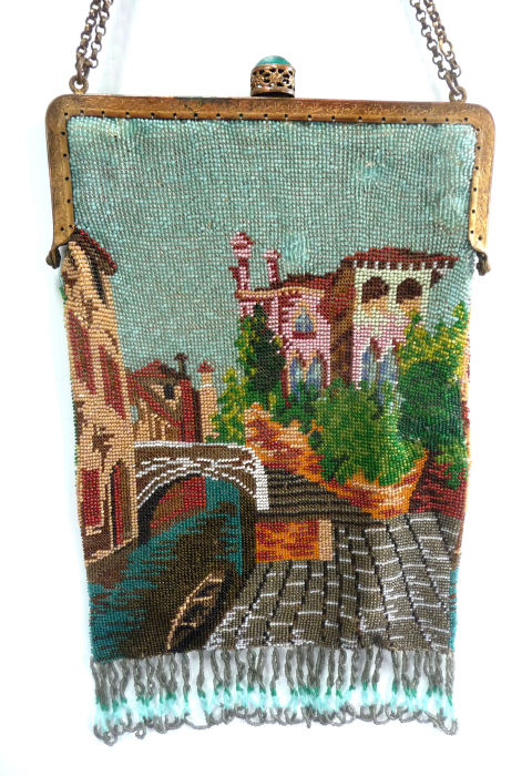 This beautiful Venetian beaded purse has been in my collection since 2002 and I have always loved the tranquil canal scene with bridge and the pink chateau in the background. The design of this purse incorporates several different sizes of beads to give contrast and depth to the picture which I particularly like in these purses. The purse is topped off with an ornately jeweled and filigreed frame with an openwork stand-up jeweled clasp and a jeweled drop pendant. The interior is lined in a pale gold silk which I don't believe is original but is nicely done. And the fringe is fabulous! Interlocking twisted loops in 3 of the colors from the purse. The purse is in excellent condition; however, there are indications of earlier repairs which appear to have been professionally done. I have included several close-up photos of these for your perusal. They have never been a factor to me as I love the design of the purse and the detail of the picture. There may be a bead or two missing (but no holes) or other smaller repairs that I fail to mention but I have mentioned anything I feel is relevant (see all photos for complete condition). The jewels in the frame are all intact although the far left amethyst cabochon has a small chip in the upper corner that I did not even notice until I was taking the photos. Measures 6-1/2" wide at frame x 11" long from clasp to bottom of fringe. First time offered! (Click on pic for more photos.) |