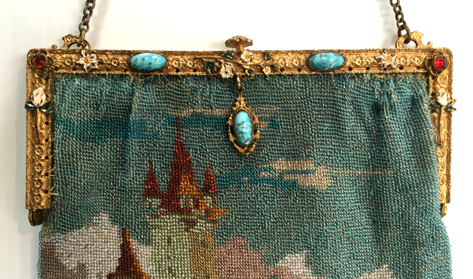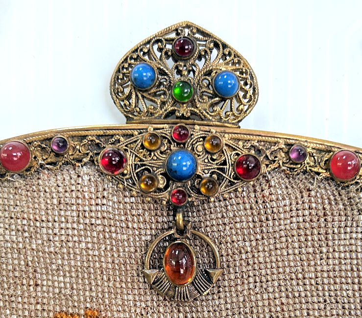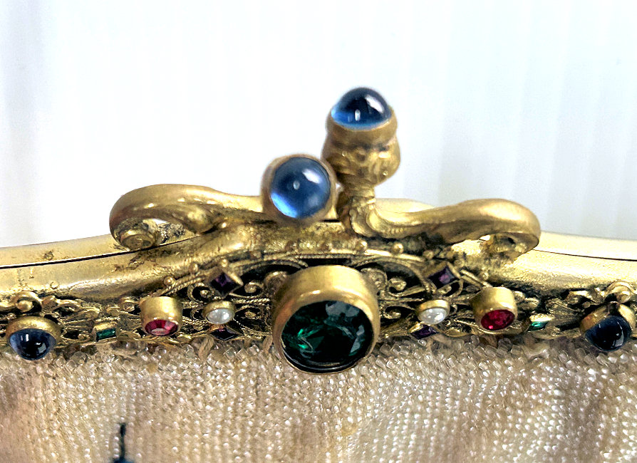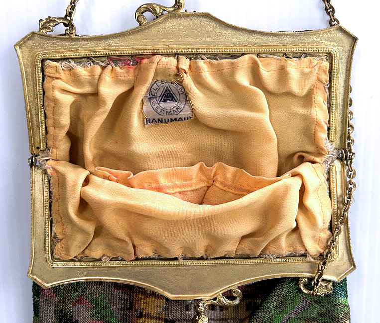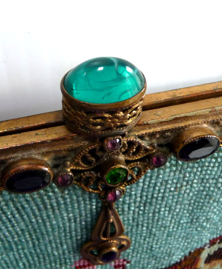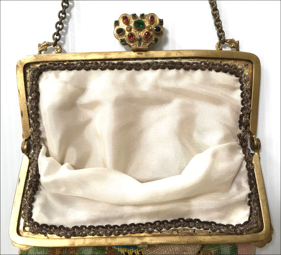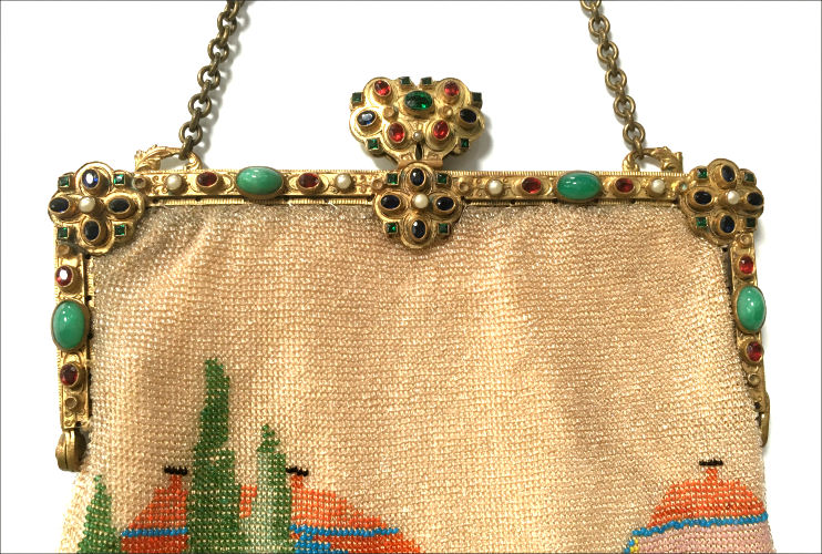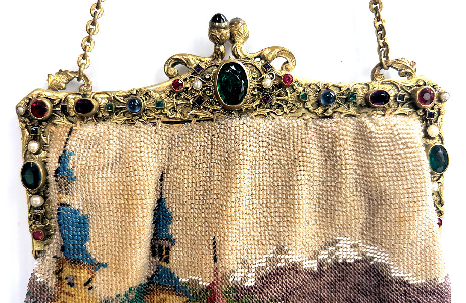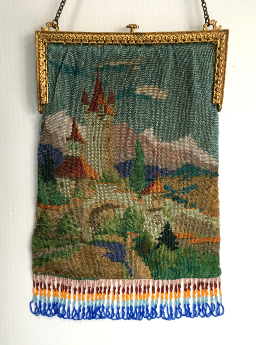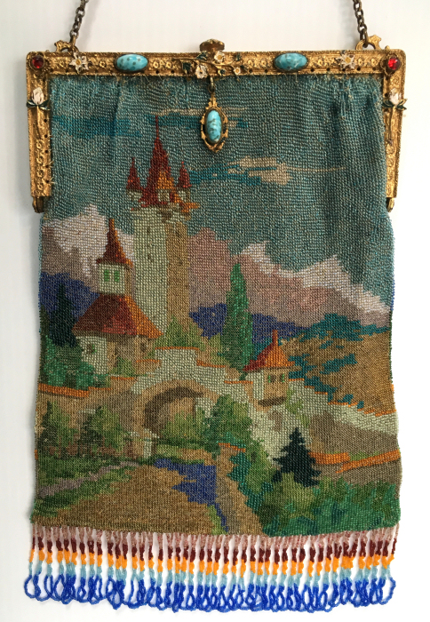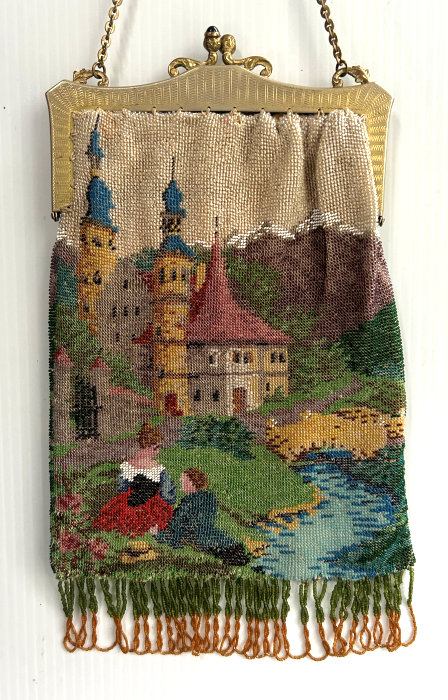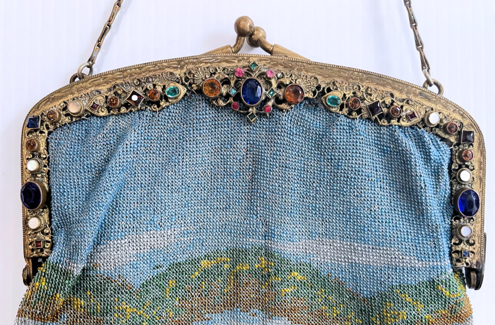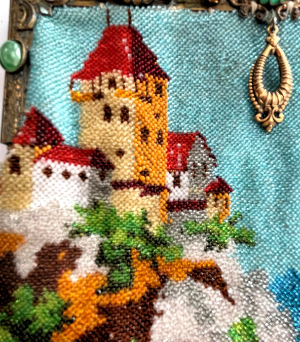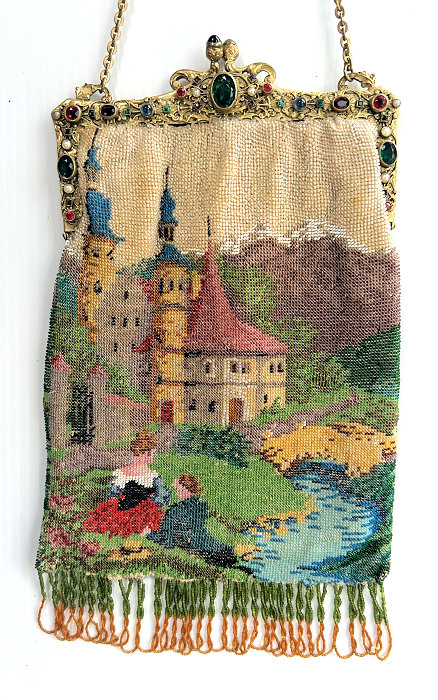 This is a beautifully handmade purse in teeny micro-beads depicting the Vajdahunyad Castle in Budapest, Hungary. There is a young lady and her gentleman sitting alongside a stream with a bridge visible in the distance. Snowcapped mountains serve as a backdrop to the lovely castle with its blue turrets. It's just such a gorgeous purse and the handmade details are evident in the fringe which is all original but the maker had some spacing issues ... to me this just adds to the character. The inside retains its original lining with pockets on both sides and the original label which reads "Ellessem Germany Handmade". And let's not forget the frame! Encrusted with multi-colored jewels, there is an overlay of filigree on the brass frame which gives it a 3-dimensional look. There are 34 jewels in the frame (one teeny one missing right above the lowest red jewel on the left side) and two light blue stones (possibly sapphires) in the kiss clasp. The chain is also heavier than is typically found on these purses and is very pretty. Measures 5-1/2" wide at the frame, 6-3/4" wide at the bottom and almost 11" long overall. (Click on pic for more photos.) |