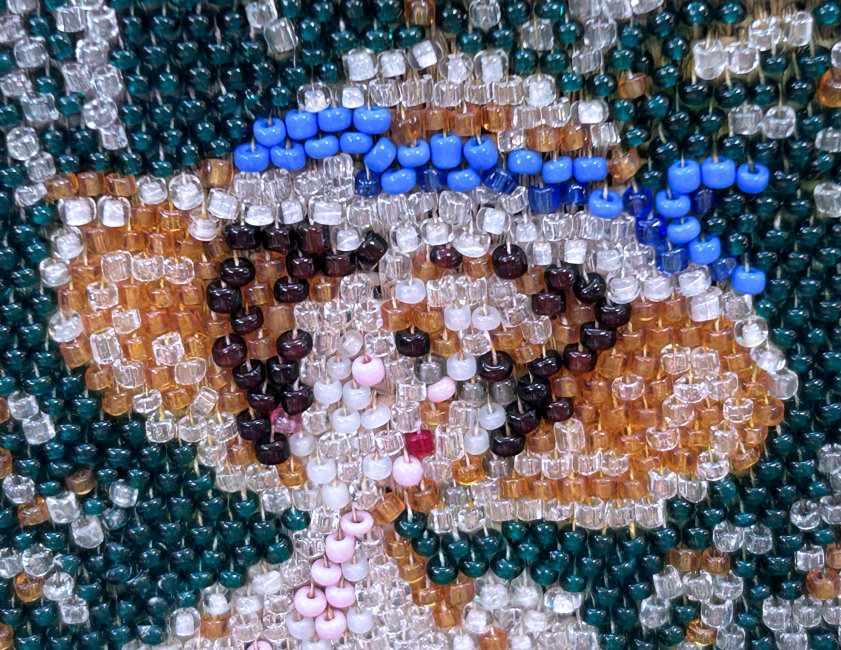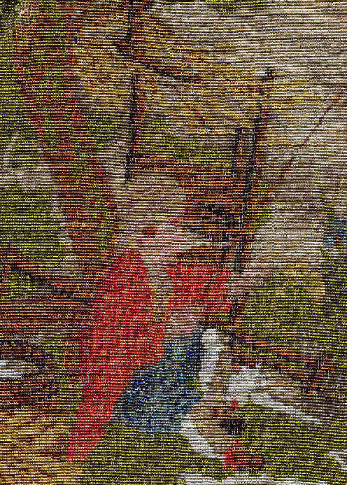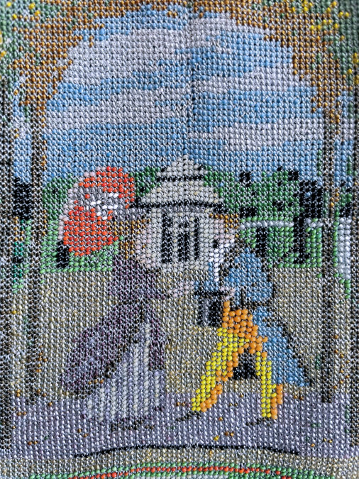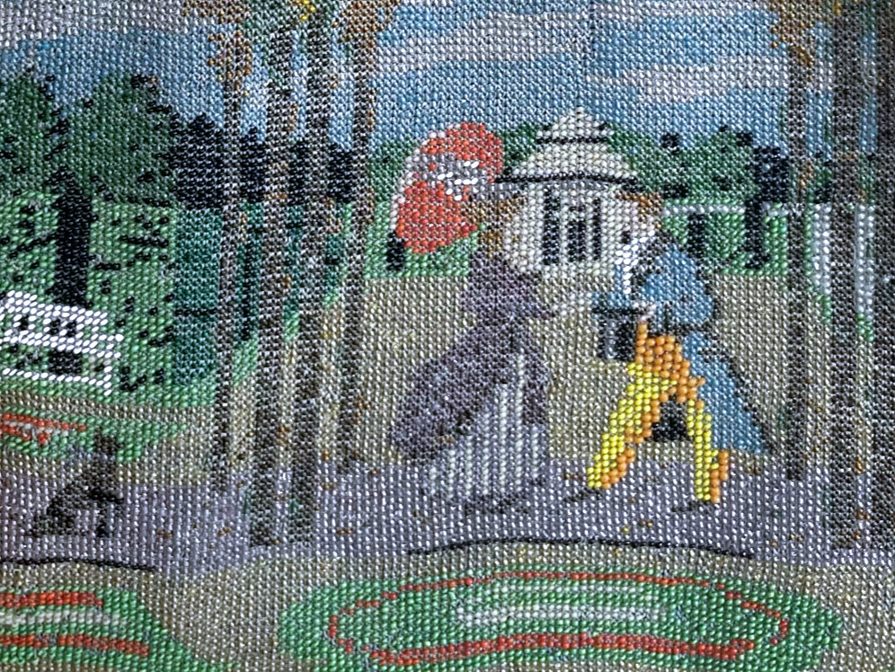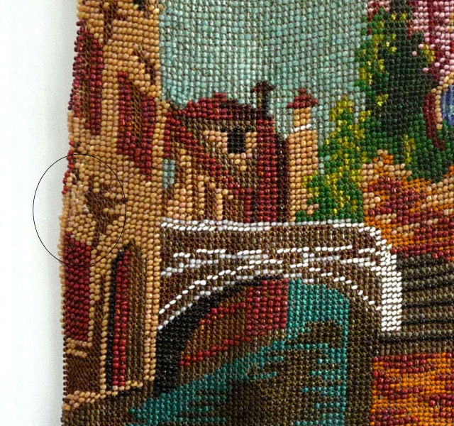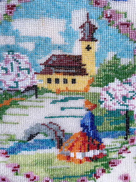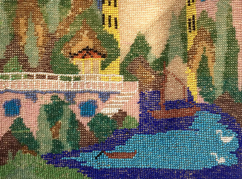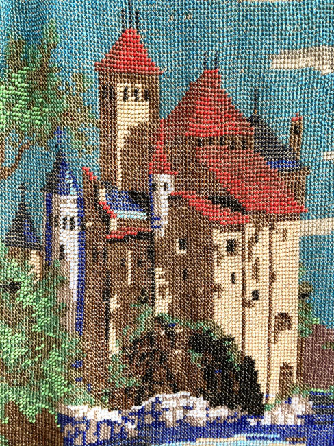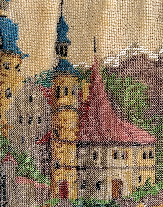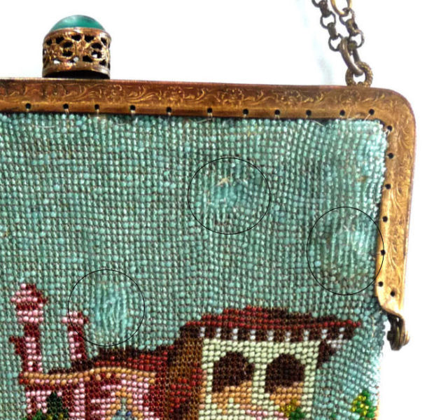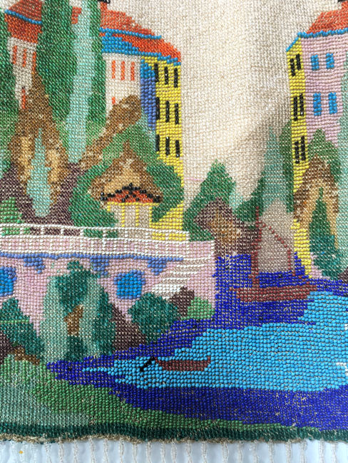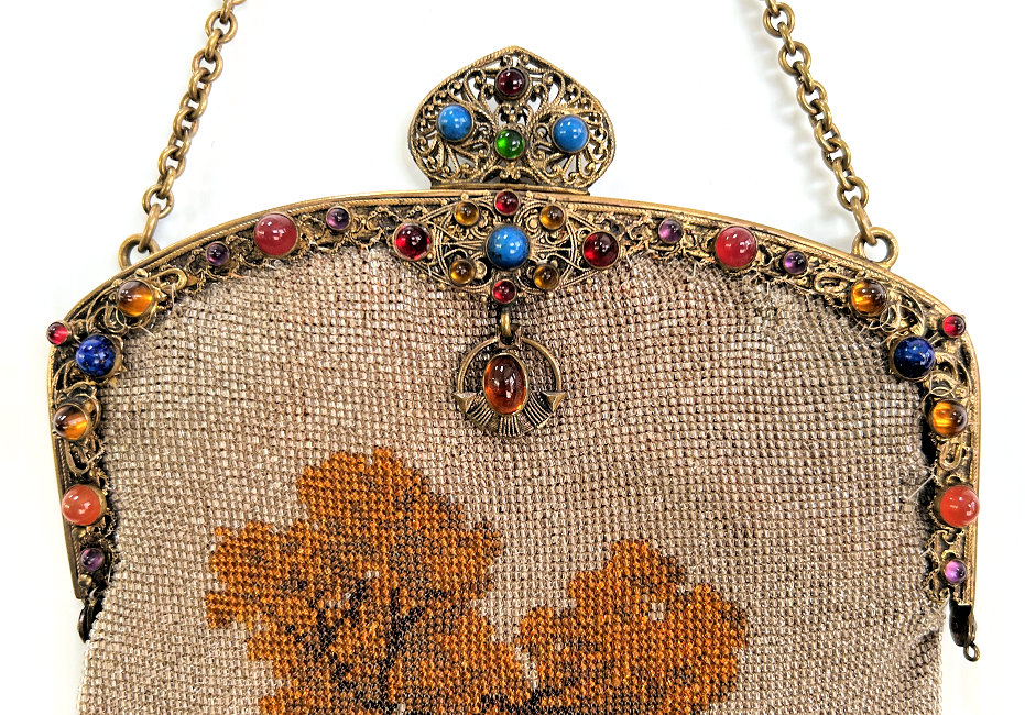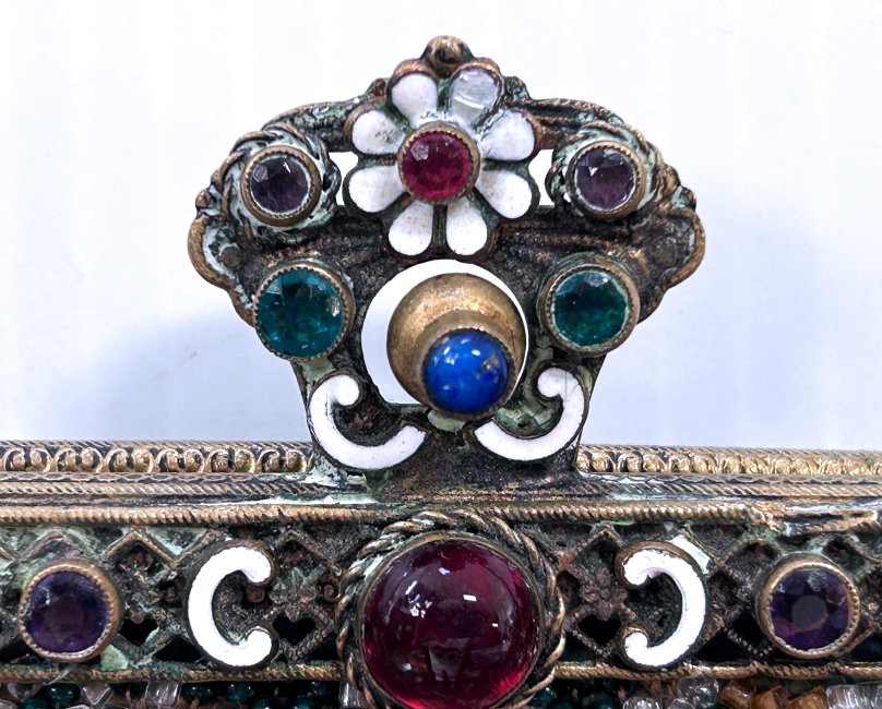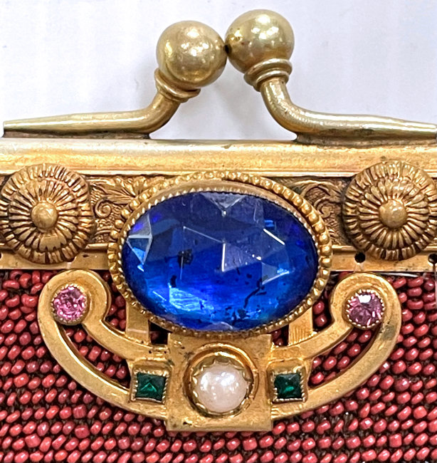 This is a beautifully handmade purse in teeny micro-beads depicting the Vajdahunyad Castle in Budapest, Hungary. There is a young lady and her gentleman sitting alongside a stream with a bridge visible in the distance. Snowcapped mountains serve as a backdrop to the lovely castle with its blue turrets. It's just such a gorgeous purse and the handmade details are evident in the fringe which is all original but the maker had some spacing issues ... to me this just adds to the character. The inside retains its original lining with pockets on both sides and the original label which reads "Ellessem Germany Handmade". And let's not forget the frame! Encrusted with multi-colored jewels, there is an overlay of filigree on the brass frame which gives it a 3-dimensional look. There are 34 jewels in the frame (one teeny one missing right above the lowest red jewel on the left side) and two light blue stones (possibly sapphires) in the kiss clasp. The chain is also heavier than is typically found on these purses and is very pretty. Measures 5-1/2" wide at the frame, 6-3/4" wide at the bottom and almost 11" long overall. (Click on pic for more photos.) |