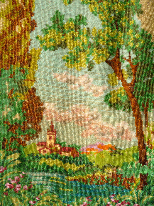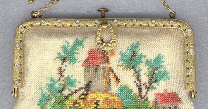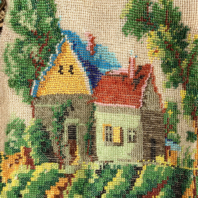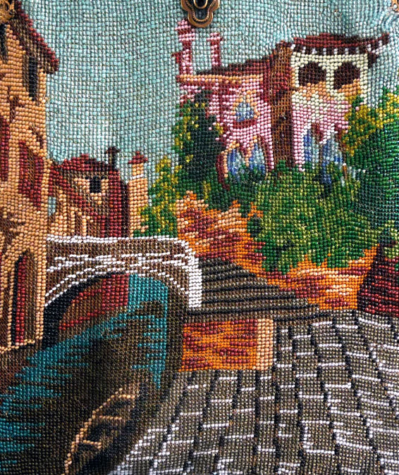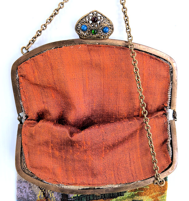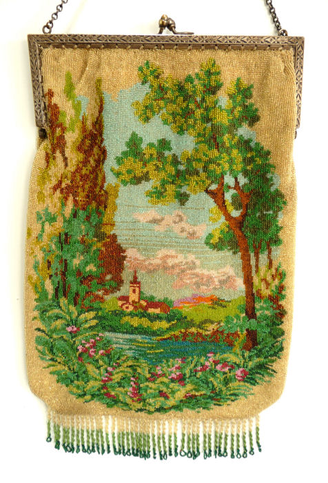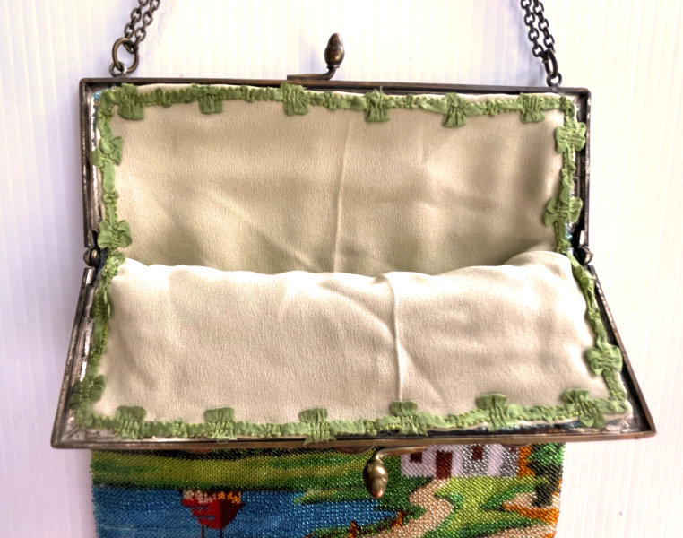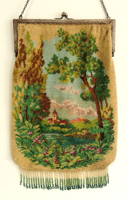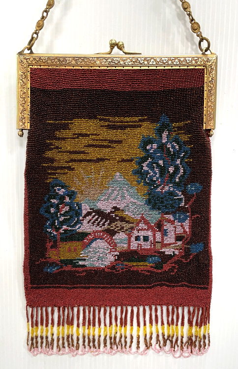 I just love the tranquil feeling of this beautiful micro-beaded purse featuring a quiet village with an arched bridge nestled in a valley beneath majestic mountains. If you look closely, you can see the sun setting with golden rays just above the mountain peaks. It is topped off with a really unique fancy frame with a large sapphire jewel in the center and smaller jewels below and on the corners. There are rosettes in the frame that are duplicated in the fancy chainlink handle ... really unique! The purse is finished in interlocking long looped fringe in colors from the purse. The interior is lined in taupe silk with gold braided trim. Purse is in excellent condition with no missing beads or damage that I can find. The only thing I would want to mention is that the frame has a slight gap due to the thickness of the lining and braiding but it closes firmly so this is not a major issue to me. The scene is a rare one that I have not run across before and justs has a very serene feel to it. Measures approximately 7-1/8" wide at frame x 11-1/2" long not counting clasp.. (Click on pic for more photos.) |