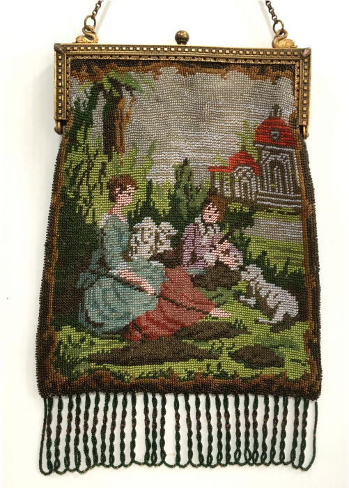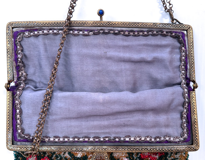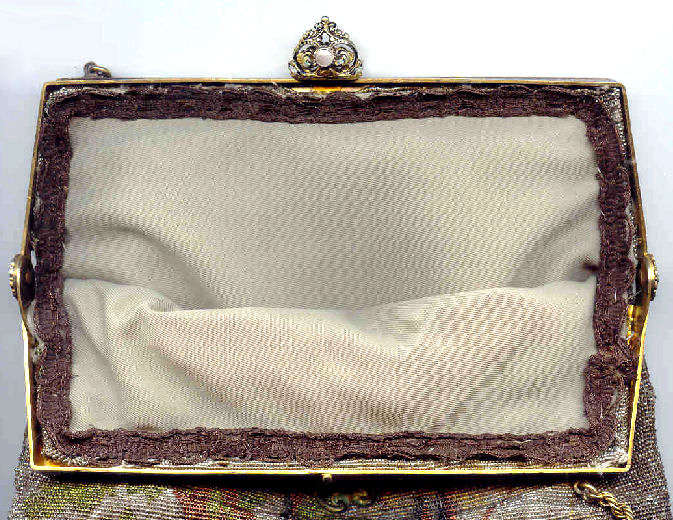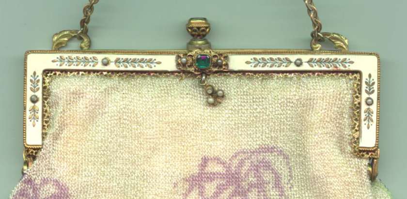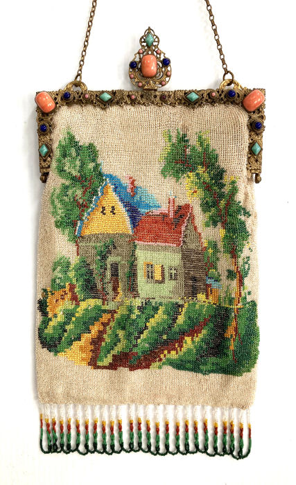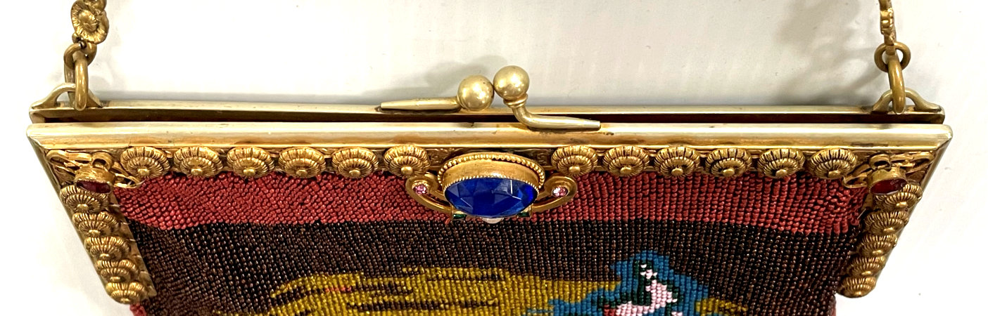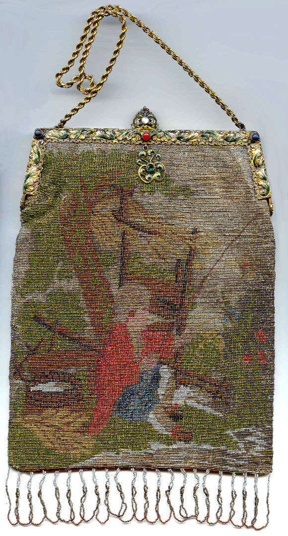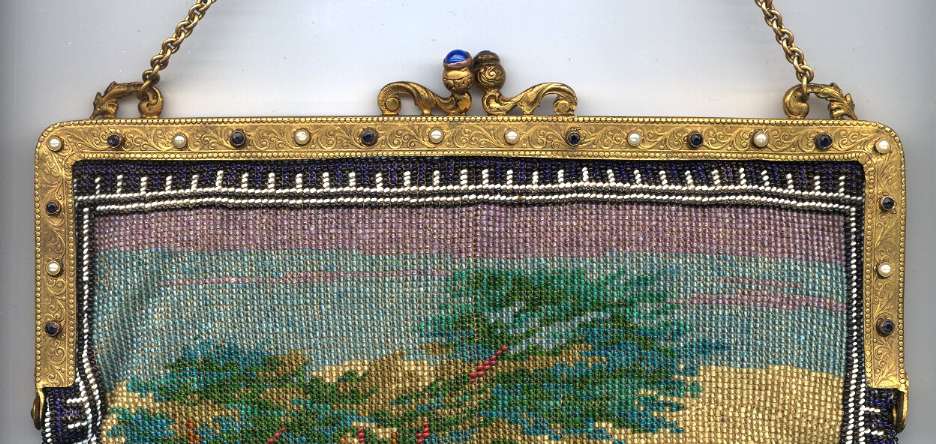 Made in Vienna by Ada Grunfeld (whose label is inside), this lovely purse is done in tiny beads and pictures a fraulein gazing out toward the mountains from a terrace. The sky is done in tones of lilac, blue, cream and pinks and looks like a sunset. This entire picture is framed in by a black border with tiny white lines outlining it and sectioning it off ... very unusual treatment and very eye-appealing. Fringe is a lovely intertwined looped fringe in lilac and greens in tones of the purse. Interior lining is in excellent shape. Frame is set with little sapphire & pearl gems all around the front and two large sapphires in the clasp. Purse is in excellent condition with no noticeable bead loss or damage. It is just beautiful! Measures 8" wide x 12" long. Previously listed at $2,600. (Click on pic for more photos.) |