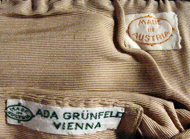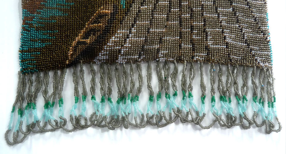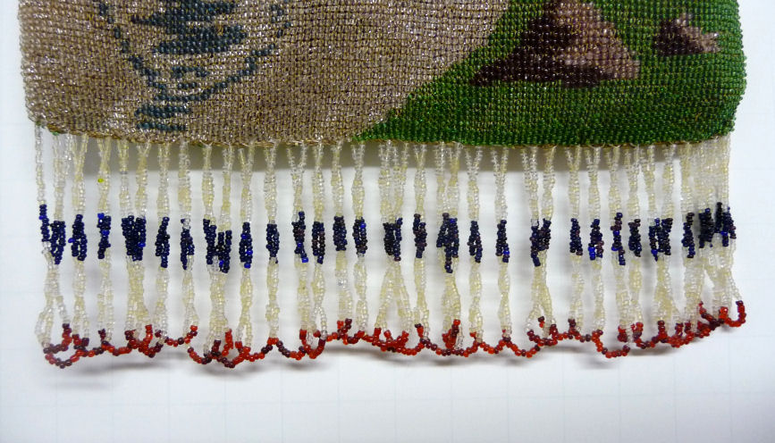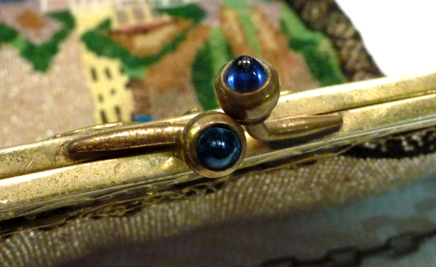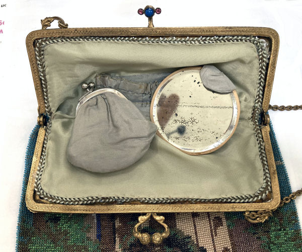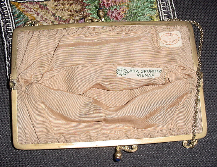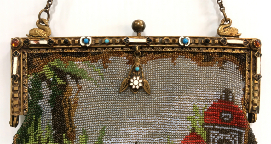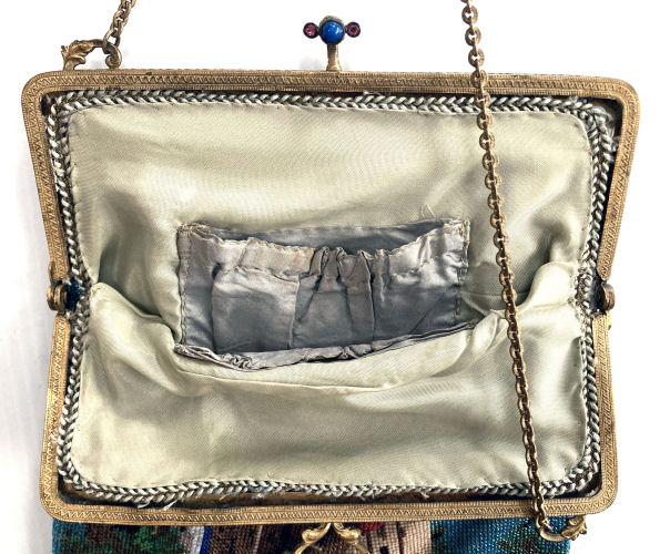 Made in Vienna by Ada Grunfeld (whose label is inside), this lovely purse is done in tiny beads and pictures a fraulein gazing out toward the mountains from a terrace. The sky is done in tones of lilac, blue, cream and pinks and looks like a sunset. This entire picture is framed in by a black border with tiny white lines outlining it and sectioning it off ... very unusual treatment and very eye-appealing. Fringe is a lovely intertwined looped fringe in lilac and greens in tones of the purse. Interior lining is in excellent shape. Frame is set with little sapphire & pearl gems all around the front and two large sapphires in the clasp. Purse is in excellent condition with no noticeable bead loss or damage. It is just beautiful! Measures 8" wide x 12" long. Previously listed at $2,600. (Click on pic for more photos.) |