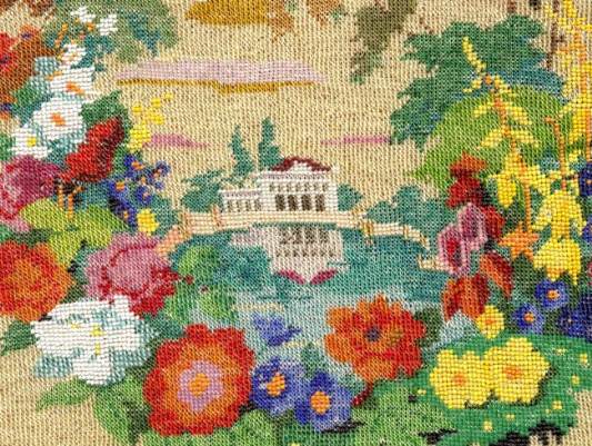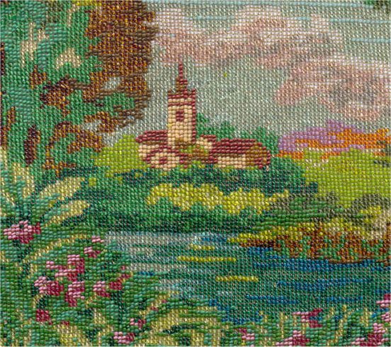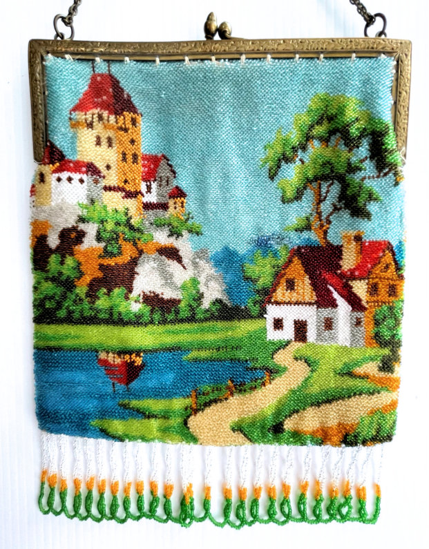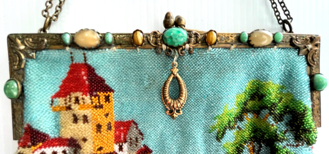 This is a very pretty scenic castle beaded purse depicting a castle with turret on a cliff overlooking a village below. There is a lake below the castle reflecting the tower in the water which is so pretty. There is a winding road with fence leading to one of the houses below. The jeweled frame has malachite gemstones and what I believe are tiger's eye gemstones which I rarely see in purse frames. The purse is in excellent condition and has looping twisted fringe in colors from the purse. This is probably a famous castle but I am not recognizing it immediately so maybe need to do some research :-) . It has been relined in a vintage fabric with pretty trim and drop pendant is newer. Measures 7" wide at frame x 7-1/2" wide at bottom edge x 10-1/4" long from top of clasp to bottom of purse. First time offered! (Click on pic for more photos.) |
