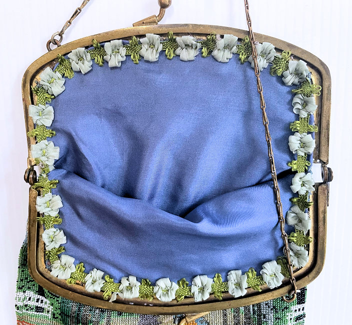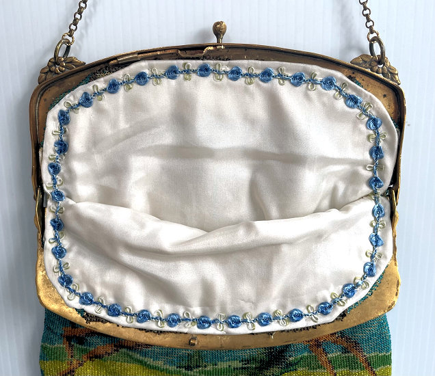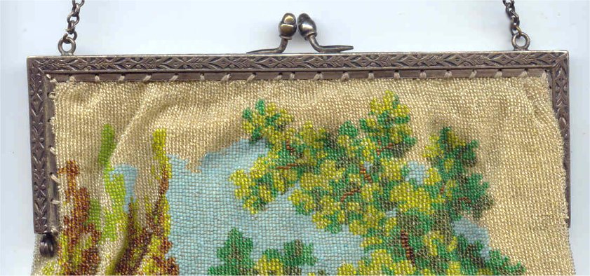 This is such a pretty scenic beaded purse rich with colors ... a castle can be seen in the center amidst puffy lavender clouds with a lake below. There are flowers in the foreground and a large tree on the right side. Frame is embossed silver and the interior is lined in pale peach silk with ruched trim (original) in excellent condition. As the frame and scene are identical on both sides, there is no front or back and can be displayed either side. The body of the purse appears to be in excellent condition. There is an older repair on the top on both sides right in the gather near the frame ... as they are inside the gathered folds, I had to really look to find them (barely visible on top right in close-up of frame pic). Fringe had several strands missing which I have had repaired. I also had the purse cleaned so it is bright and pretty. Large size ... measures 7" wide at frame, 8" wide at bottom due to the gathers, x 13" long including clasp and fringe. Previously listed at $1,350 with damaged fringe. I recently had the fringe repaired and the purse cleaned so the price has been adjusted accordingly. (Click on pic for more photos.) |