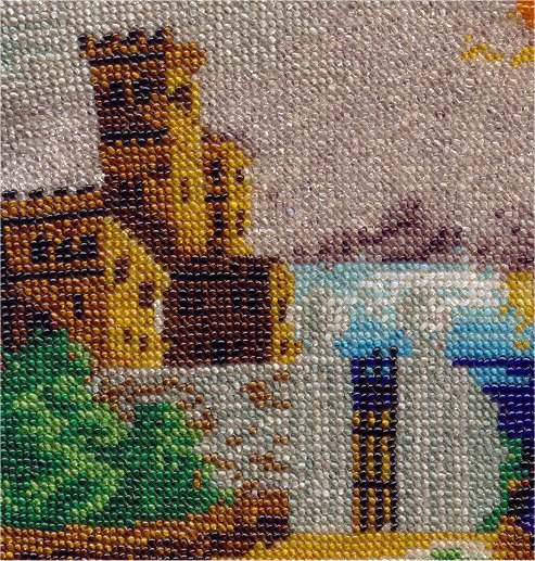 Here is a lovely scenic castle beaded purse with an arched bridge in the foreground. I love the turrets on the castle and the mountains in the background. This is probably a famous castle but I am not recognizing it immediately so maybe need to do some research :-) . When I bought the purse, there was no fringe on it so I had the fringe professionally added and it picks up several of the colors of the purse and really sets it off beautifully. It has also been relined in a vintage fabric and the original flowered braided trim has been retained for originality. The jeweled frame is also fabulous with three cabochon turquoise jewels and two faceted ruby jewels in the corners. There are also little enameled flowers as well. Back of the purse has the same design. Overall it is in excellent condition with no missing beads that I can see and no damage of any kind. There may be an older repair or two along the top edge for stability but I can't swear to this. It looks great to me! Measures 6-1/8" wide at frame x 7-1/4" wide at bottom edge x 11" long from top of clasp to bottom of purse. First time offered! (Click on pic for more photos.) |