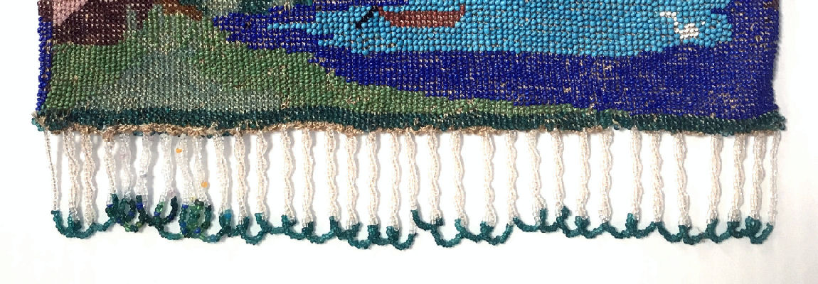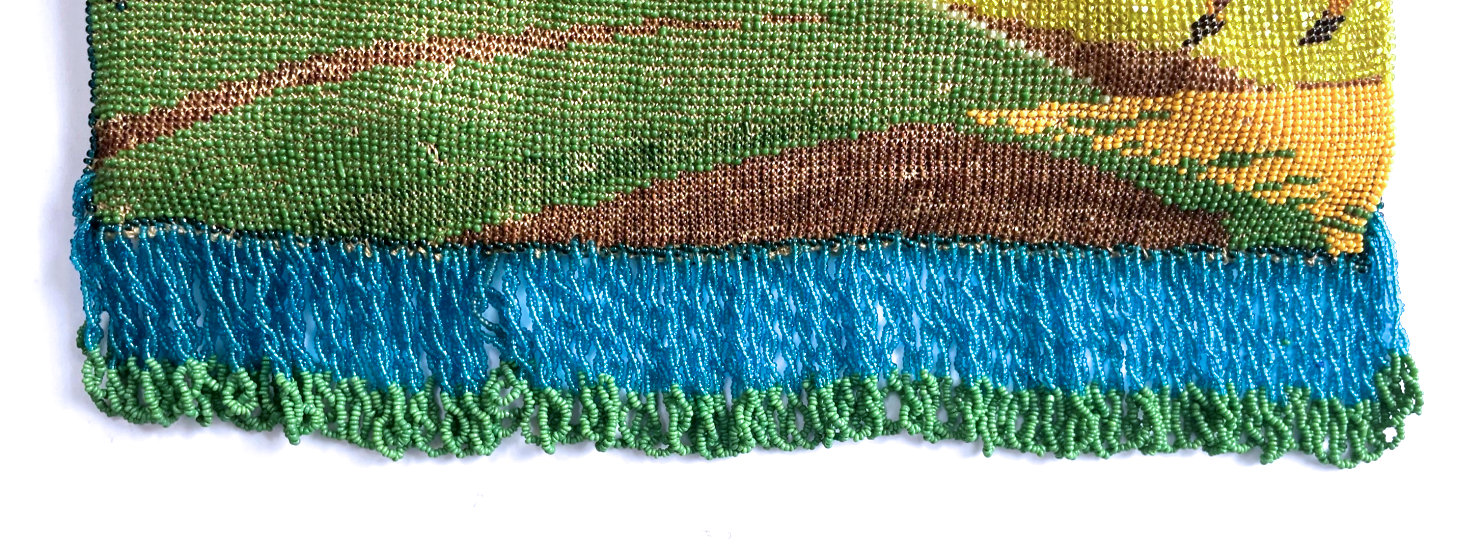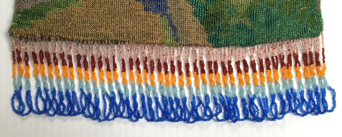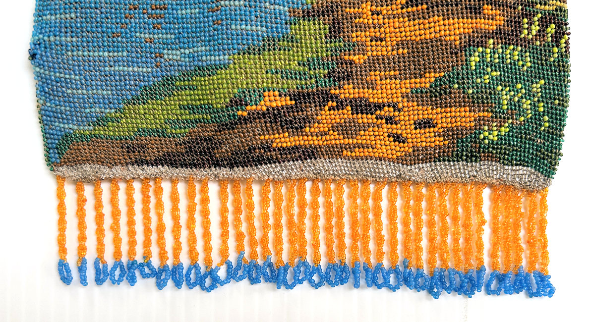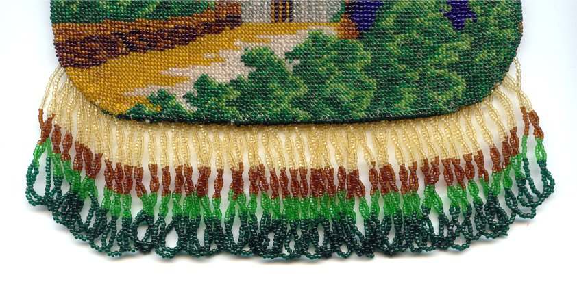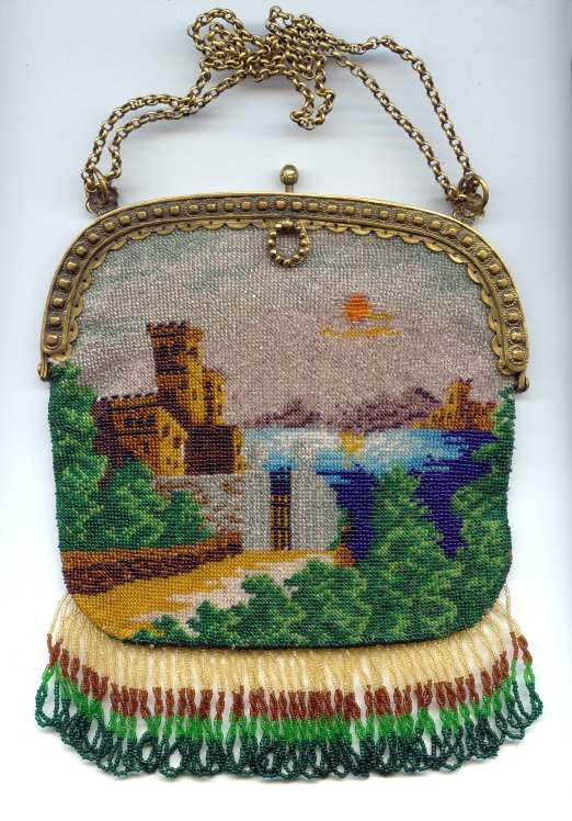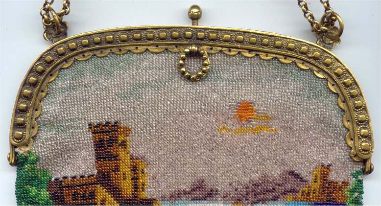 Scenic beaded purses are so hard to find and this one is a fantastic example. Tiny, tiny beads knit into this intricate design of a walled roadway leading to a gate behind which can be seen a towering castle on the left and a lake ahead. Across the lake another castle and purple mountains can be seen. A bright orange sun is sinking in the sky above the horizon. Fringe is intricately done in four colors from the purse in tightly twisted interlocking loops. Interior is lined in a deep blue with pink rose braided trim. Gold embossed frame and double chainlink handle finish it off. Purse is in MINT condition! Rare size ... measures 6-1/2" wide at frame x 8" long to bottom of fringe. Previously listed at $1,800. (Click on pic for more photos.) |
