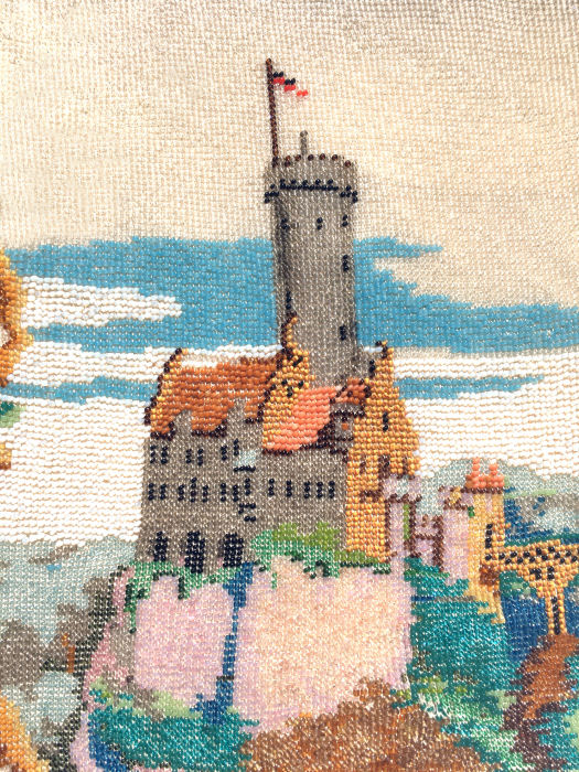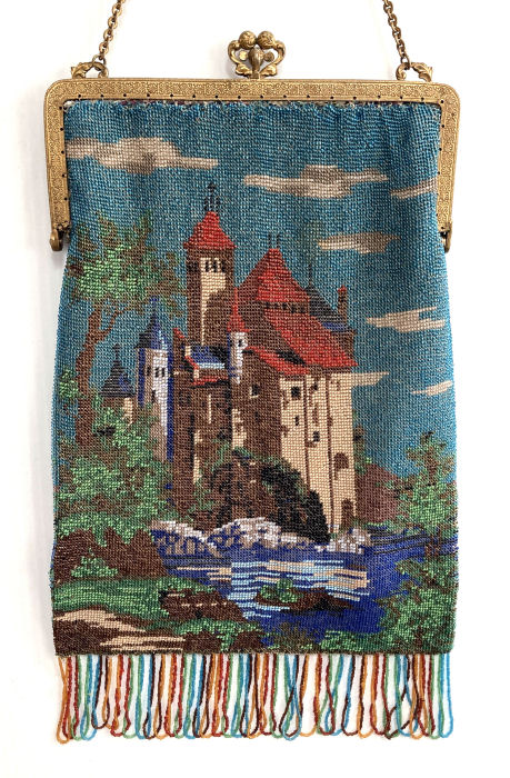 This is a beautiful scenic castle beaded purse featuring a famous castle "Chateau de Chillon" in Switzerland. It is quite stunning with its castle set along a lake with a stone wall set along the water's edge. Red tile roofs top the castle with its turrets reaching into the clouds. Two turrets have a cross on the top, so a chapel or two can be seen along with the castle. Both sides feature the same scene and the purse is finished in a lovely long looping fringe in colors from the purse. The frame is quite unusual in that the clasp is heart-shaped and the three jeweled section is the part that snaps through the heart ... never saw another like this. The frame itself has several tiny jewels (some are missing but so tiny it's hard to notice) and enameled designs. It is very ornate. The interior is newly relined to replace the shattered original but the pockets, mirror and little change purse were retained from the original purse and added to this one so that it is as much original as possible. Overall it is in excellent condition and would make a stunning addition to any collection. Measures approximately 6-3/'4" wide x 12-1/2" long overall. Previously listed at $2,975. (Click on pic for more photos.) |