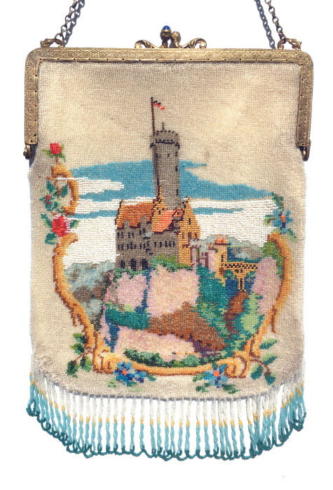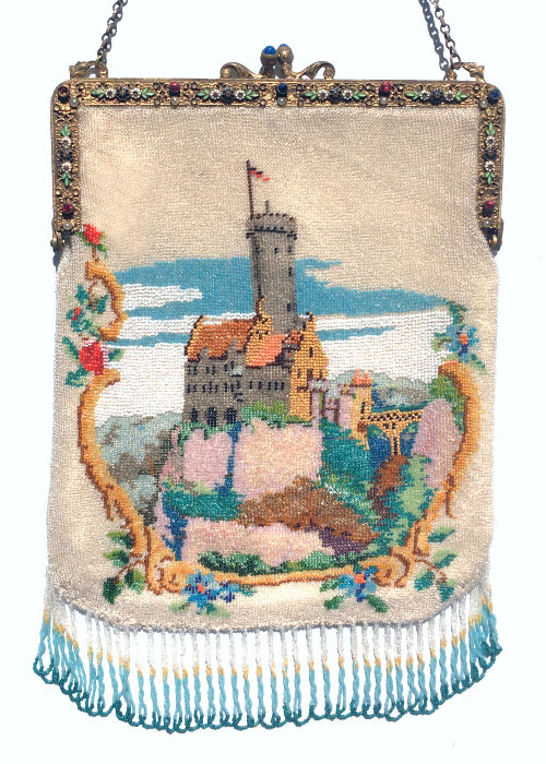 This stupendous micro-beaded purse bears a likeness of the rarely seen Lichtenstein Castle in Wurttemberg, Germany. The intricately detailed scene is done on a background of bright ivory beads that are almost white (please forgive pictures which have dark shadings where shadows reflect -- the beads are all bright and clear and have no dark areas). The purse is topped off with a lovely jeweled and enameled frame and has a kiss clasp with two lapis jewels. The fringe is a beautifully intertwined twisted loop fringe in colors from the purse and finish it off perfectly. Inside you will find a perfect ivory silk lining with embroidered rosettes on a braided trim. It doesn't get much better than this ... entire purse is in immactulate condition with possibly a professional repair done at the bottom of the brown rock cliff on the front of the purse but I can't swear to that ... just a little thicker area which could be in the original making as well. Measures 7" wide at frame x 11-1/4" long from top of clasp to bottom of purse. First time offered! (Click on pic for more photos.) |