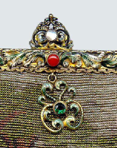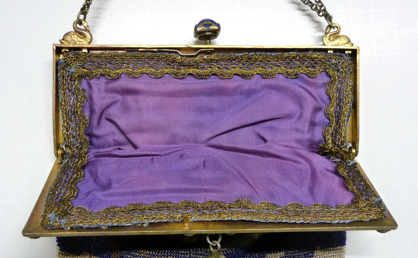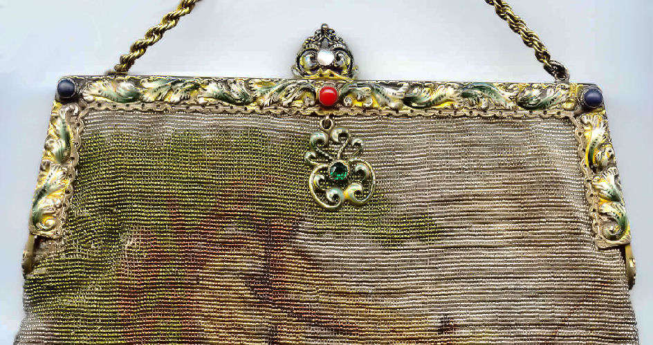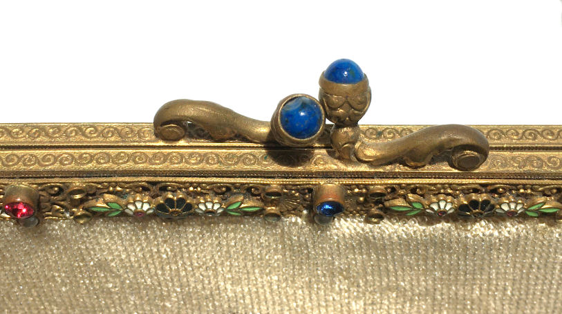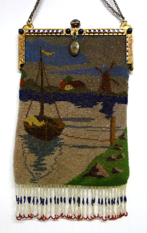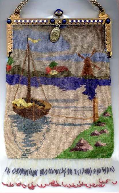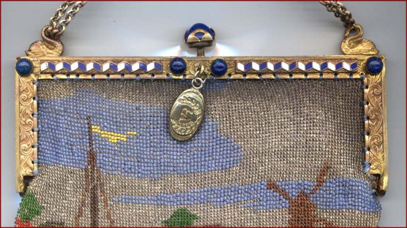 Here we have a very rare scenic picturing a moored sailboat with a village and windmill in the background. The colors are bold and vivid, and it is topped off with one of the most gorgeous frames I have run across. It is set with four round lapis jewels across the front with cobalt and white diamond-shaped enameled designs between. There is a huge pyramid-shaped lapis jewel in the clasp, and the double chain handle is held by two swans. The lining appears to be newly redone in purple with gold braided trim and is in perfect condition. Fringe is done in red, white and blue intertwined loops, all there and perfect. In fact, the entire purse is in mint condition with the only apology being a very teeny professional repair on the back lower portion that I had to look hard to find. It is barely worth mentioning as you really don't see it at all. The drop pendant may be a replacement as it is more silver than gold; however, it could just be that the brass plating is worn to the base metal since that portion of the purse was handled more. . . hard to say. Measures 6-1/4" wide x 10-1/2" long to bottom of fringe. Previously listed at $2,200. (Click on pic for more photos.) |