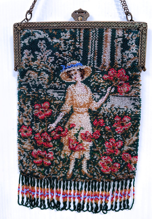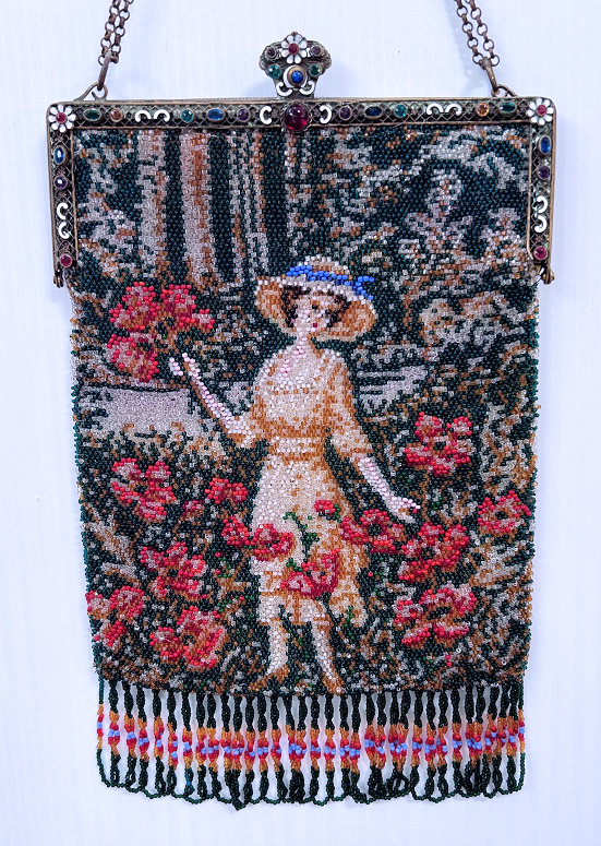 This is a beautifully handmade beaded purse depicting a beautiful lady wearing a hat with a blue ribbon stroling among a garden of what appear to be red roses. She is carrying a bouquet of the same red flowers in one hand. The frame is done in multi colored jewels between enameled decorations. The fringe is intertwined in looping fringe in colors from the purse. The back side of the purse features the same scene except in mirror image so there are subtle differences. Interior is lined and has a braided trim. Overall it is in excellent condition ... the enamel on the frame has some missing areas but very slight and really not noticeable. The handle is a double link chain. Measures 7-1/4" wide at the frame x 11-3/4" long overall from top of clasp to bottom of fringe.. NOTE: In all my years of collecting, I have never run across another purse like this one so I would consider it to be VERY rare indeed! (Click on pic for more photos.) |