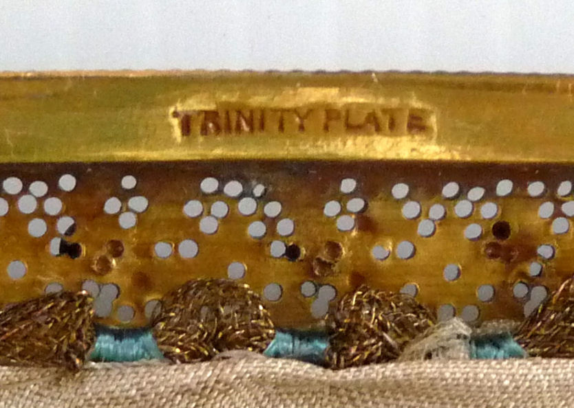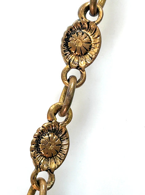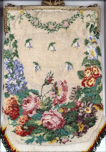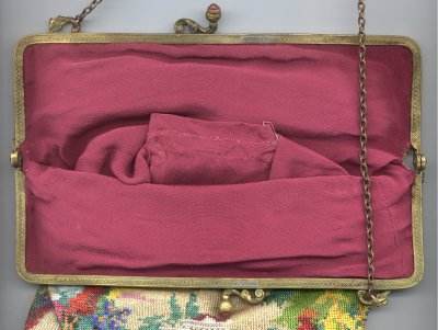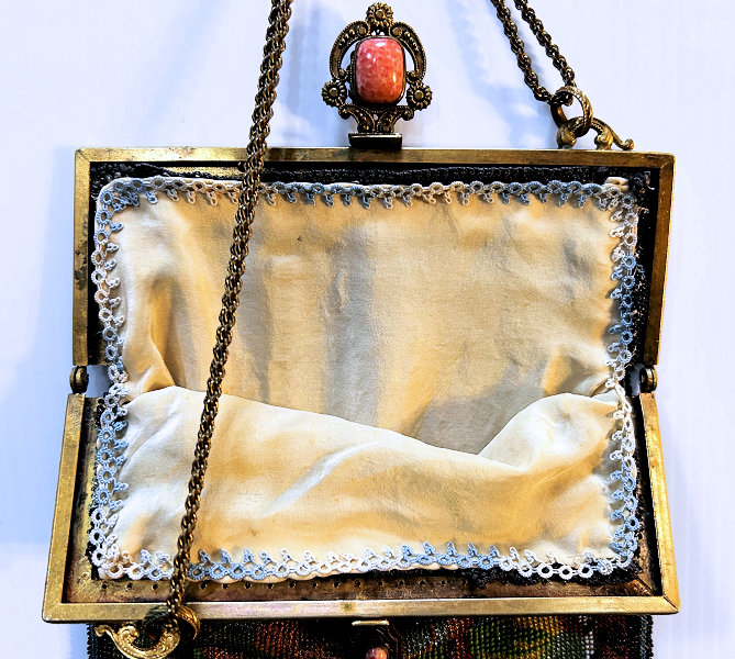 This is such a lovely beaded purse in really pretty colors. I love the shape of it ... this one has the gathered pinwheel shape to the bottom with a single beaded tassle ... which also dates it to the 1800's. The tops, however, is finished in an unusual manner. Instead of being a reticule with a drawcord, this one has a frame which is the way it was done originally. The frame on this one is a true masterpiece with three large pillow cabochon carnelians and enameled daisies and leaves all set on a brass filigreed backing. Voila! The interior has been newly relined in white silk with pink French ribbon rose trim. The condition of the purse itself is exemplary. I can only see a bead or two missing here and there ... nothing major at all. And there is one early -- and appears to be professionally done -- repair. This is to be expected in a bag of this age. It is on the front of the purse and is visible in the photo above but only if you know exactly where to look as it blends in so perfectly (hint ... it's about half way down and to the right side of the long orange flower). This is a very large purse ... measures a bit over 7" across at the frame, 8" across the bottom, and 12-1/2" long to bottom of fringe. Previously listed at $1,350. (Click on pic for more photos.) |