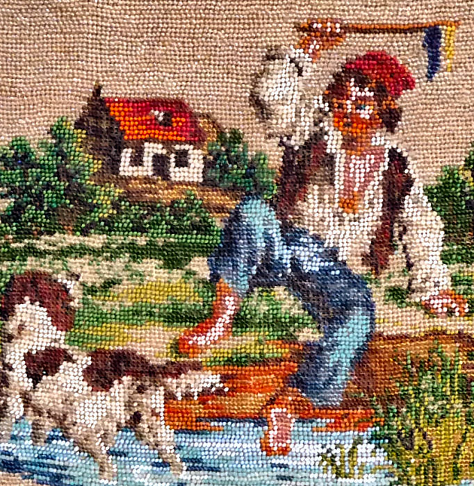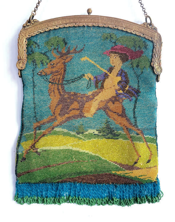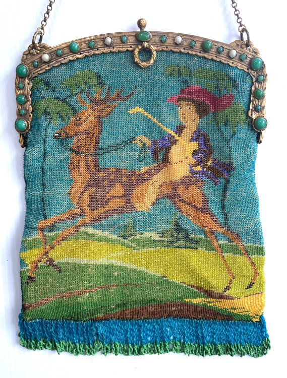 What a whimsical scene this is! Usually the lad is riding a horse and chasing a stag for the hunt. In this depiction, the young man is riding the stag ... just so cute! Colors are gorgeous and the frame is absolutely fantastic with malachite and pearl gemstones adoring it from end to end. And just look at that fringe! It's about as thick and lush as it can be. Both sides depict the same scene and it is in excellent condition. Inside is lined in a light ivory colored silk with pretty French silk ribbon trim. Measures approximately 7-1/'4" wide x 10-1/2" long overall. (Click on pic for more photos.) |