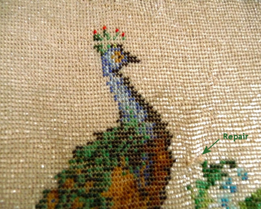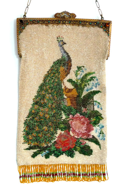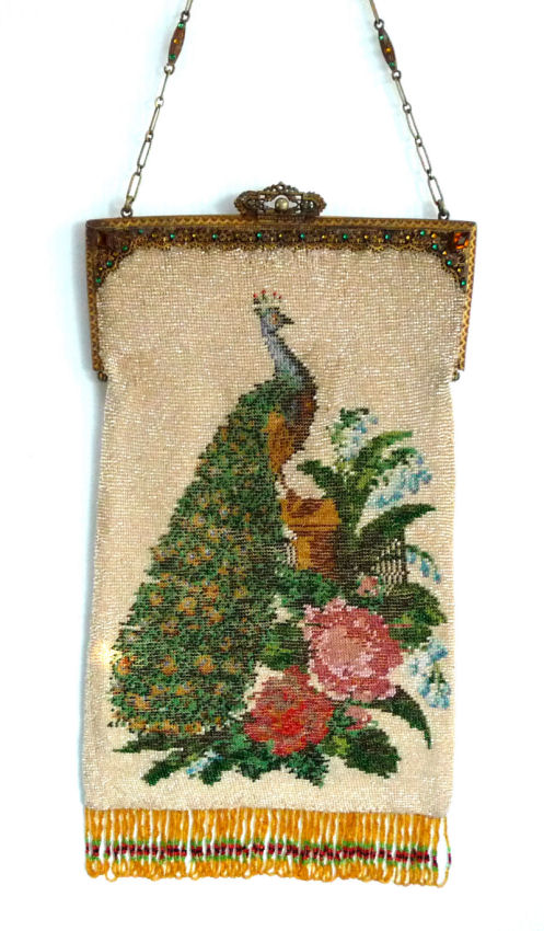 This purse has long been in my private collection (since 2006!) and only recently have I decided to part with it to go to the next purse lover to enhance their own collection. The purse features a full-figured majestic crowned peacock on both sides perched in a lush garden on a background of ivory micro-beads. Both sides of the purse have the same scene and the fantastic Trinity Plate frame is jeweled on both sides as well. And even the chain is jeweled! There are two ornate segments on either side with jewels on both sides. One of the segments is missing a center jewel on one side but I may be able to find a match for this in my stash. The front of the frame has 27 alternating emerald and topaz jewels and 2 large diamond shaped topaz corner gems. The back side of the frame is the same but missing one of the topaz corners and one of the tiny topaz stones. I may be able to match the small stone but I know I don't have the corner one. The fringe is done in colors that pick up the shades of the garden and peacock and just finishes it off perfectly. There are some very minor professional repairs made to the purse whch are pretty insignificant. The most noticeable I have pointed out in the photos and it is on the front of the purse between the peacock's chest and the flower. Interior is lined and in excellent condition. This purse is absolutely HUGE and measures 7-5/8" wide at frame x almost 8" wide across the bottom x 14" long from clasp to bottom of fringe. Be sure to look at all the photos. First time offered! (Click on pic for more photos.) |