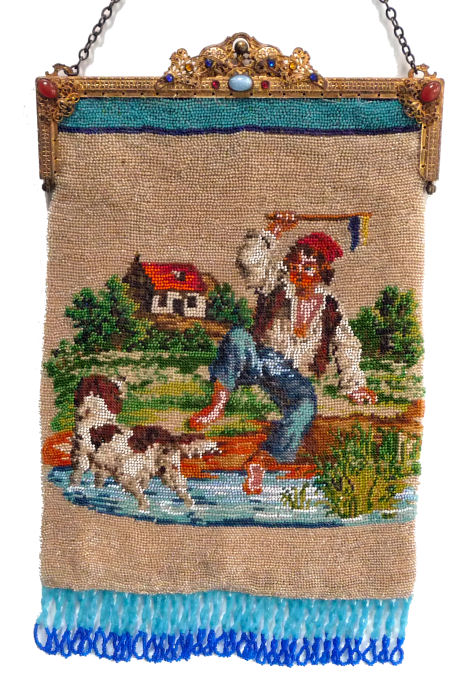 Here we have a truly unique steel-beaded purse with two different figural scenes on the front and back. The front features a young boy sitting alongside a stream with his fishing rod in hand. There is a fence in the background and a well to the left with water in it. I'm not sure what the wooden framework is above his head ... perhaps part of a dock with thatched cover? I just can't tell. Colors are very vibrant in person with bright orange-red, blue, pale silver, green, browns and golds, all quite sparkly. The back of the purse shows a young lass reaching up to hang a bird cage in a tree. The colors are much more vivid in person ... I had to fade the picture to show the detail better. Her dress is bright blue with a pink sash and the other colors are green, bright gold, brown and silver gray. It is quite pretty. The frame is just beautiful ... it has enameled flowing leaves on both the front and the back, and the front is additionally embellished with three jewels across the top as well as a jewel in the clasp and drop pendant. The top of the clasp is filigreed and enameled as well. The chain handle is braided and twisted for an extra heavy carrying strap for this heavy purse (steel-beaded purses can be quite heavy and need the extra strength). Interior is newly relined in pea green silk with dark gold braided trim. Finished off in bronze and silver beaded fringe. Excellent condition with no bead loss that I can find ... some expert repairs were done around hinges and sides to reinforce some loose areas. It is now in great shape! Measures 7" wide x 11-1/2" long to bottom of fringe. Previously listed at $1,995. (Click on pic for more photos.) |
