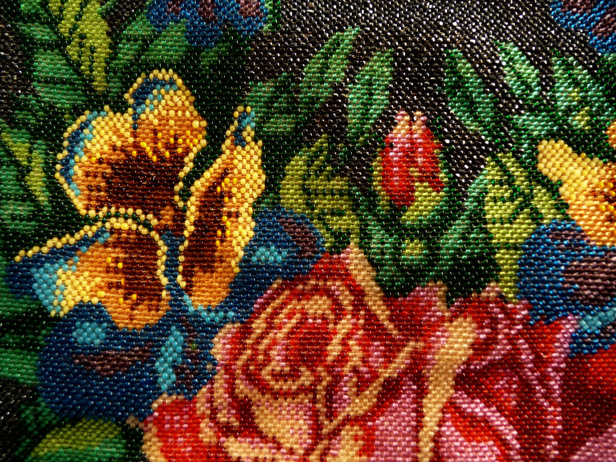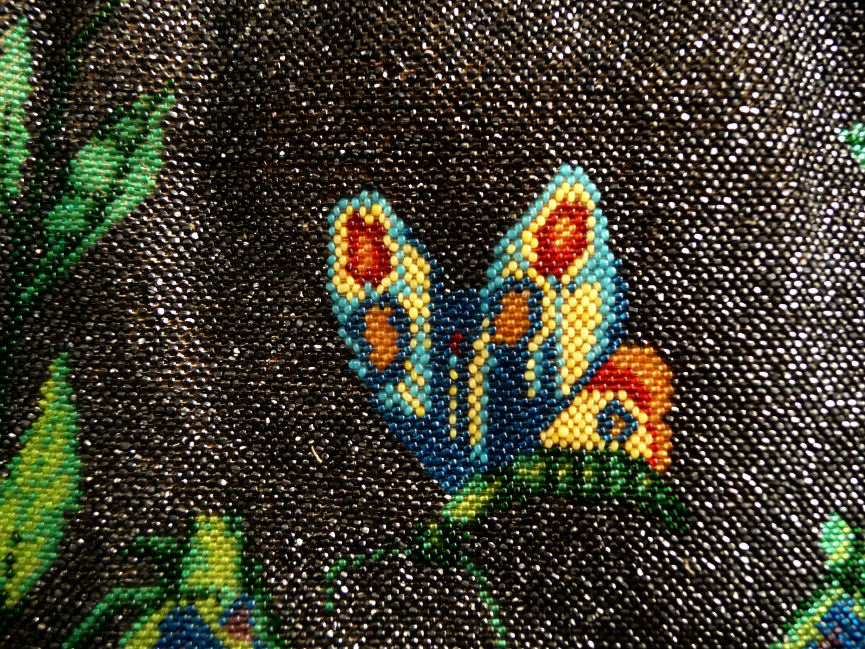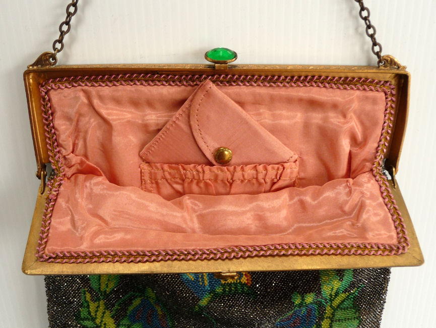 Here is a purse that I have owned for many years ... as a collector of all things with butterflies, this one always spoke to my heart but it is time to move it along. The purse is quite large and is done in jet black beads which, unfortunately, reflect the light and make the purse not as vibrant in photos as it is in person. The rose on the bottom is almost 3-dimensional looking with the shadings in the colors. The blues are especially rich and all of the colors just pop on the black background. The frame is just gorgeous with sapphire and ruby colored gemstones across the front and a large emerald jeweled clasp. There is even a tiny emerald stone in the drop pendant! The bottom is finished off with an elegantly beaded latticed fringe. Inside of the purse is lined in a pink moire with ruched pocket and matching coin purse, all of which is in excellent condition. As for the body of the purse, the front and back sides are identical and don't have any apologies that I can see. If you look at the side edges of the purse, there may be some scattered bead loss along the sides but this could also just be the backing fabric showing over where the purse folds. In any case, as it is along the sides, it is not noticeable from the front or back. Large size ... measures 8" wide at frame, 8-1/2" wide at bottom, x almost 15" long including clasp and fringe. First time offered! (Click on pic for more photos.) |