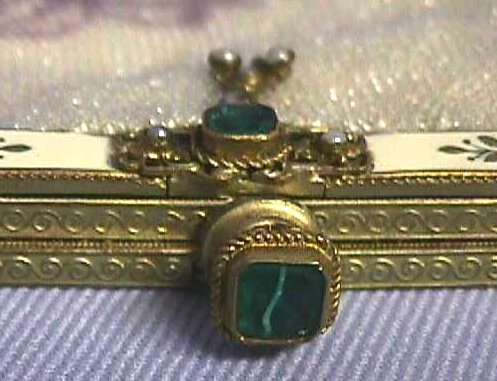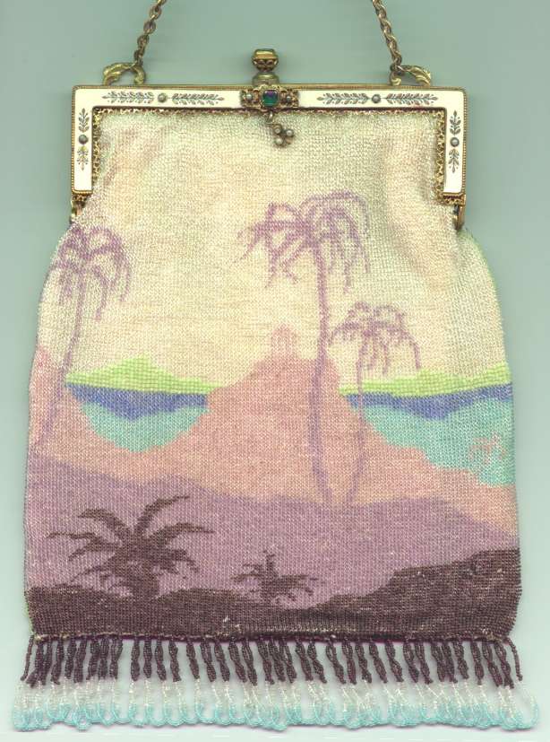 Now you are looking at another of my personal favorites ... this one reminds me of desert sands and palm trees and has an Egyptian feel to it (in my opinion anyway) with a little gazebo in the center. The enameled frame is snowy white on the front with incised decorations cut into it. It has a turquoise stone set in the center and in the clasp as well. The purse itself is done in very tiny micro beads and is in MINT condition. Both sides are identical except for the frame, which is white enameled on the front and embossed brass on the back. Interior lining is too perfect to be original so was probably a recent replacement. It is white silk with a braided border that matches the purse so exactly that you would never know it wasn't original. Fringe is done in purple, clear, and aqua colors of the purse. This is a magnificent piece in a very rare design! Measures 5-1/2" wide at frame, 7" wide at bottom, and 9-1/2" long. Previously listed at $2,399. (Click on pic for more photos.) |
