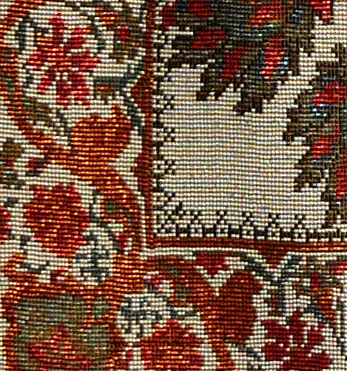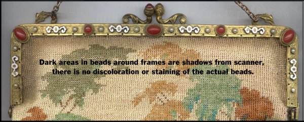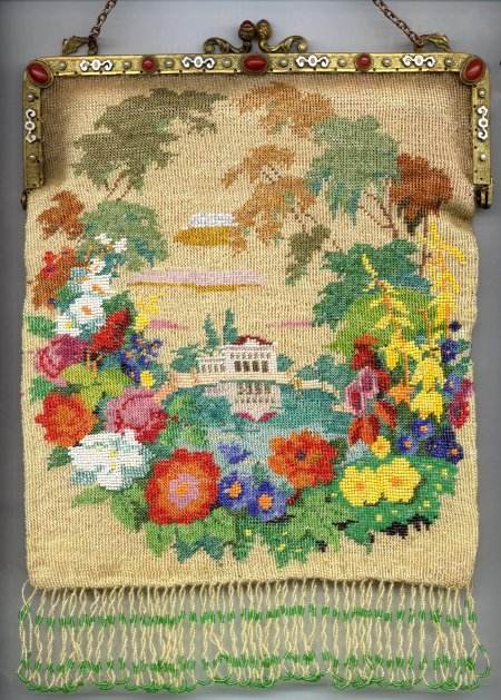 This is an absolutely FABULOUS beaded purse with an outstanding carnelian and pearl jeweled frame with enameled trim. The scene is a mansion (looks like the White House!) with a reflection pool in front set in a vignette of flowers and trees. It actually gives you the feeling that you're peeking through a lush garden and can see the mansion off in the distance. It is really fantastic! The colors are rich and vivid, and the beads are extremely tiny. A true work of art! The clasp has two carnelians as well, and the fringe is intertwined long beaded loops in cream and green. Interior is lined in burgundy with a little pocket. Entire purse is is MINT condition and quite striking! Purses of this quality are getting harder and harder to find ... unlike some designs that you will find again, this is a rare pattern that I have not seen before. Measures almost 8" wide x 11-1/2" long from tip to bottom of fringe. Previously listed at $2,650. (Click on pic for more photos.) |