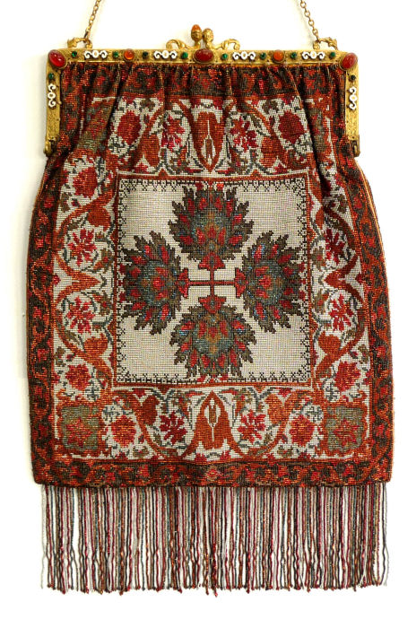 This is an outstanding beaded purse with a killer jeweled and enameled frame. The clasp is a filigreed fan with 7 jewels just in it! The jewels are all present, and there is only one tiny area of green enamel chipped (visible in frame pic). Condition of the purse is also fantastic ... there are no holes or missing beads, fringe is perfect, and lining is all intact with only a very tiny split or two in the very bottom. It even still has its original matching mirror! The fringe on this one is thick and lush and is tipped in vibrant colors of gold, red, and green from the purse. All original -- all excellent -- this is a real beauty! Measures 8" wide x over 14" long to bottom of fringe . . . a very large size. Previously listed at $1,599. (Click on pic for more photos.) |