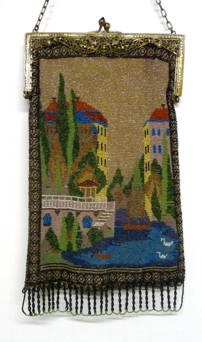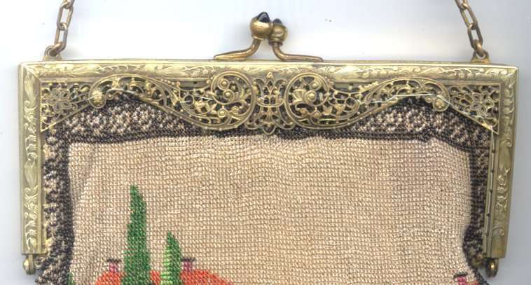 This is one of the prettiest scenic castle purses I've seen ... the colors are just gorgeous! Both sides are identical and "framed" in black and gold border giving it a picture frame effect. The castle on the left of the river has a large piazza overlooking the water with steps down to the dock. A boat can be seen in the foreground and anotehr further back in the water. I believe this is a Venetian waterway. Two ducks can be seen in the front right corner as well. All original and in excellent condition with a missing bead here and there as is typical with these older purses ... no large area of loss at all. Frame is richly filigreed and identical on both sides. Lined in a very fragile silk in great shape! The fringe has long interwined loops tipped in green and there is a secondary shorter scalloped beaded fringe between each loop at the top. Very unique! Measures 6" wide x 11" long to bottom of fringe. Previously listed at $2,650 ... now offered at my cost! (Click on pic for more photos.) |