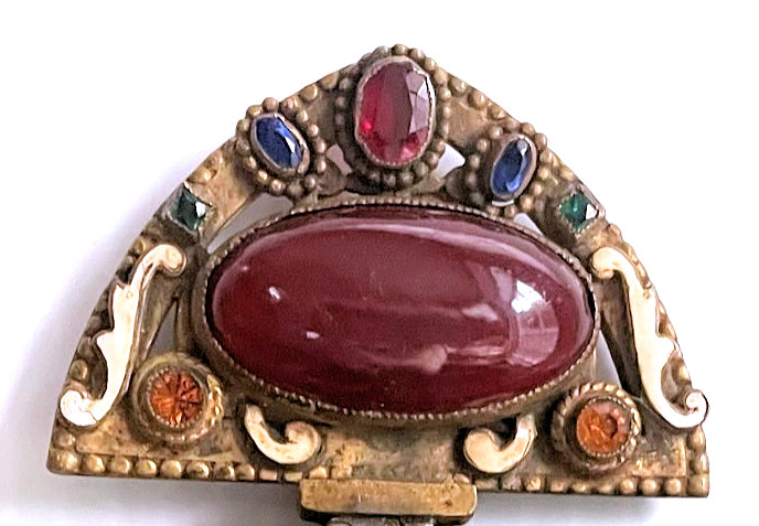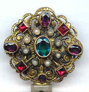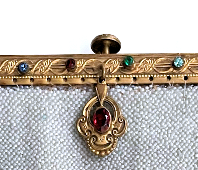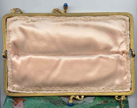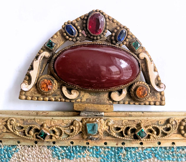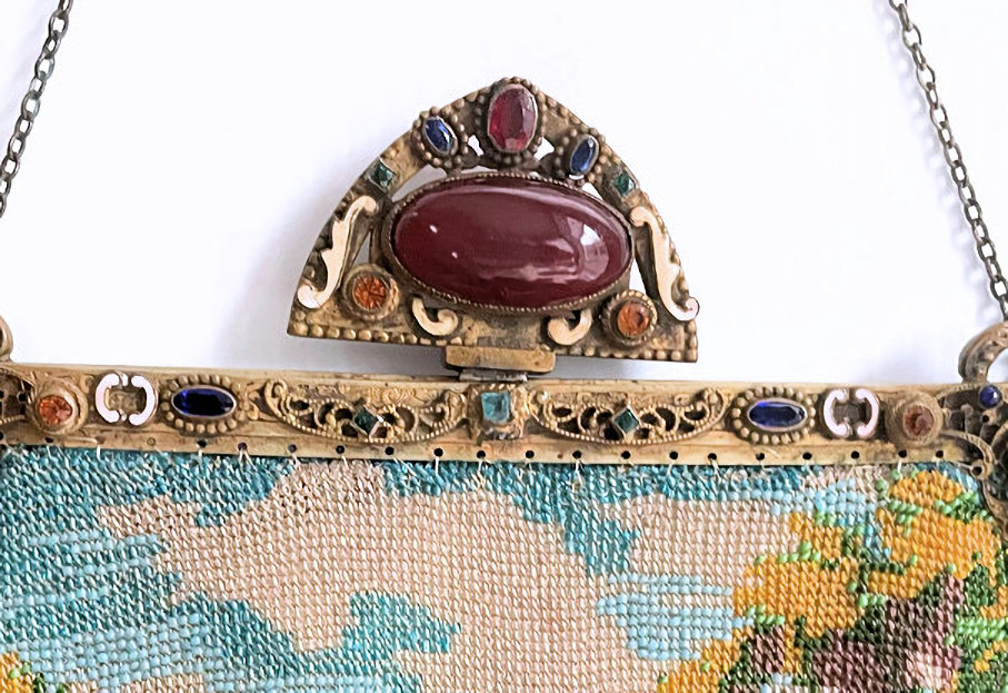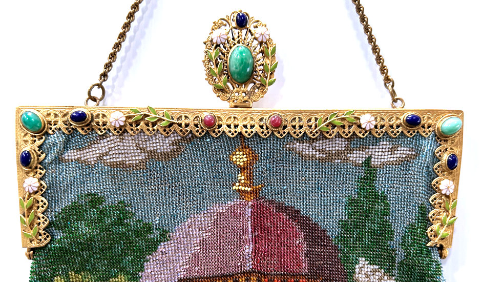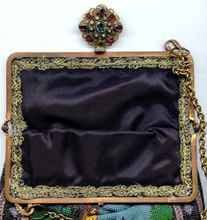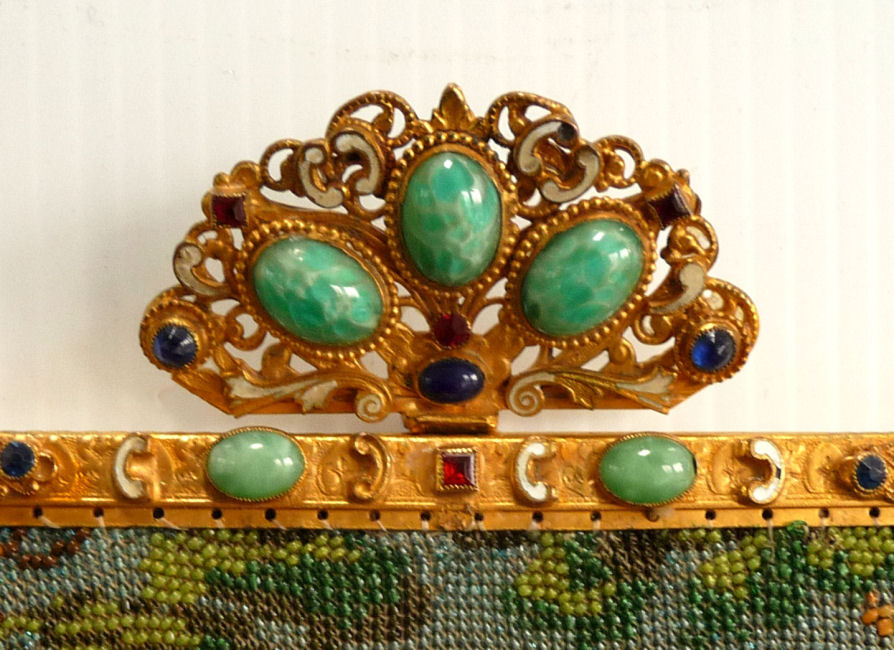This gorgeous micro-beaded purse features a couple outside an estate with an onion dome atop the house. Dressed in their Sunday finest, the gentleman is bowing to his lady fair and kissing her hand ... how sweet! The colors are very vibrant and it is in absolutely perfect condition with no bead loss or damage anywhere that I can see. The frame is spectacular boasting jewels and enameled accents on the frame as well as the drop pendant and the 2" high filigreed crown jeweled clasp. All stones are present and accounted for. The fringe is a lovely intertwined looping fringe in matching colors to the purse. The interior has its original lining in pink silk with braided trim and a little ruched pocket. The enamel on the crown clasp has a bit of discoloration and a few small chips but I had to inspect it with a loupe to say that for sure as I could not feel them or see them. Measures 7" wide x 13-1/2" long including the clasp and fringe. (Click on pic for more photos.) |