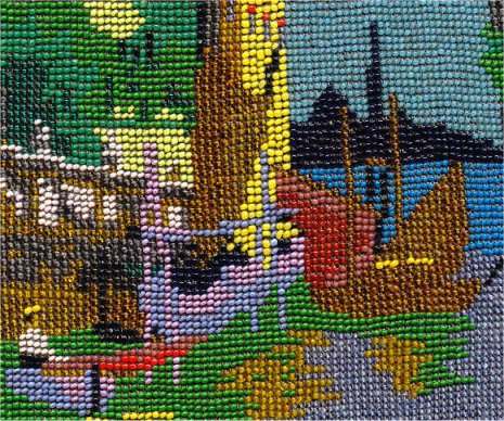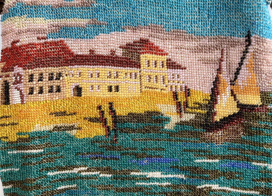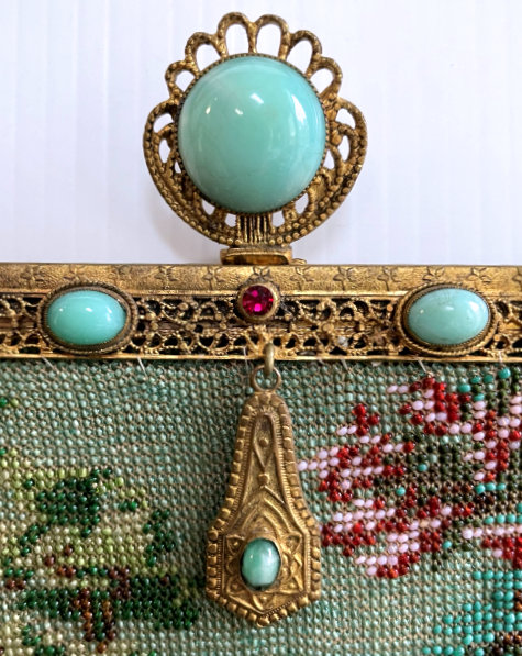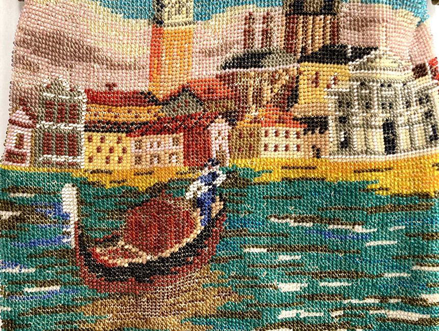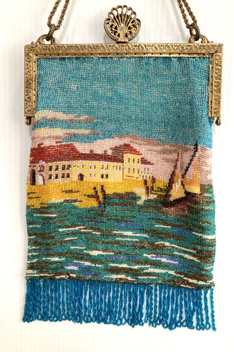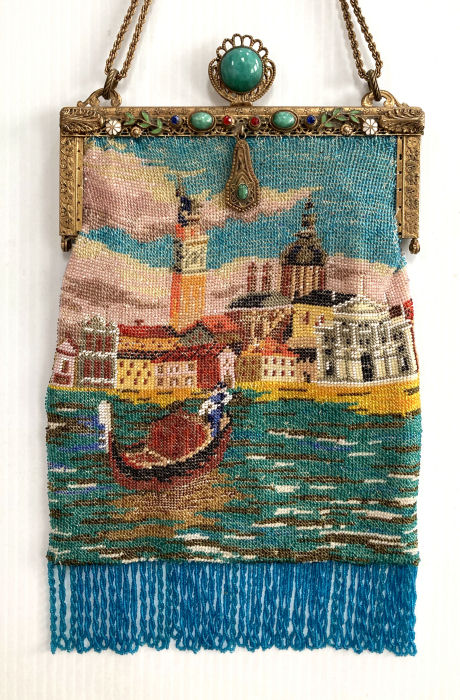 By far and away one of the most spectacular purses I have ever owned! This stunning Venetian beaded purse depicts a continuous (wraps around the purse for a full mural effect - see inset) scene of a Venice village with canal and gondola with gondolier. The gondola is on the front side of the purse; the reverse side continues the scene and there is a sailboat coming in from sea on the far right edge. There are about a zillion different bead colors in this purse making it as detailed as a painting! As if this isn't enough, just look at that frame! The main part of the frame has jewels and enameled daisies ... but then the clasp ... it has a huge malachite jewel in the center and a matching stone in the drop pendant. The fringe is done in a rich turquoise color that mimicks the colors of the ocean. The inside has its original (I believe) lining in excellent condition with French ribbon roses trim. This gem measures a tad over 6" wide at frame, 6-1/2" wide at bottom, and almost 10-1/2" long from clasp to fringe. First time offered! (Click on pic for more photos.) |