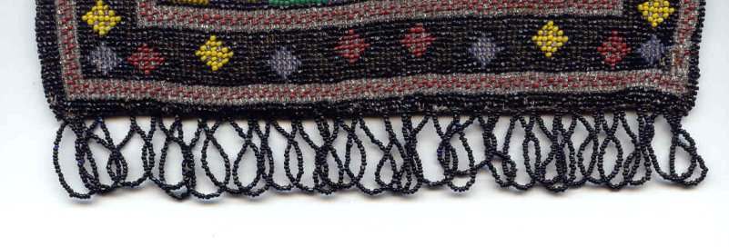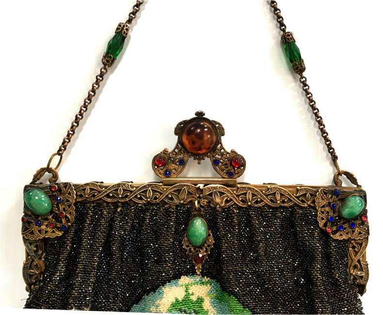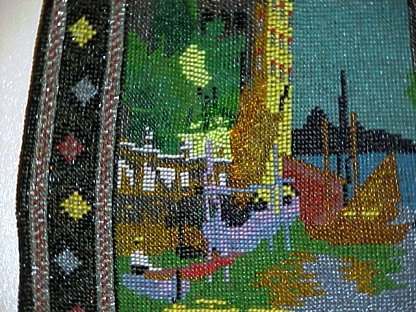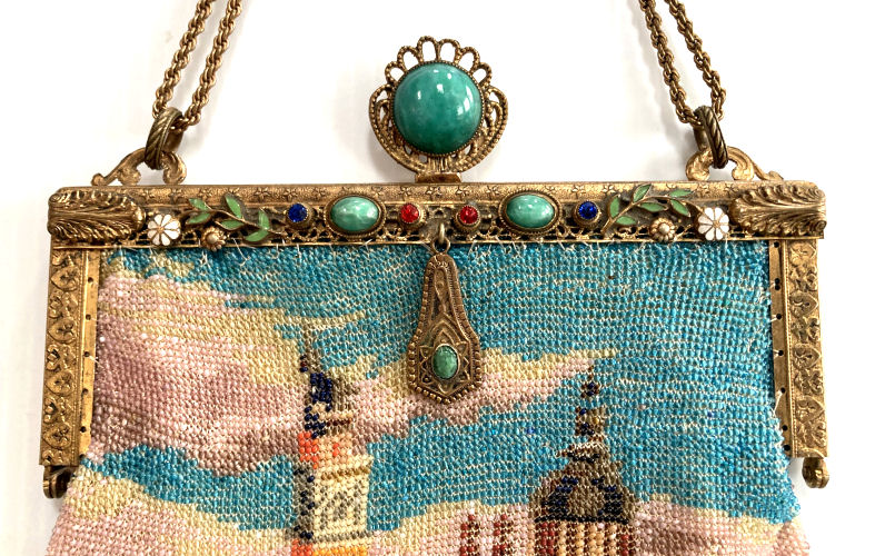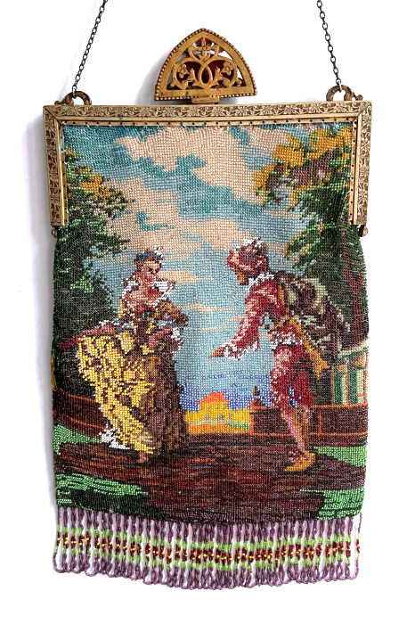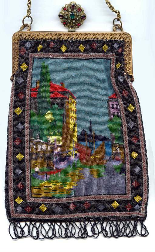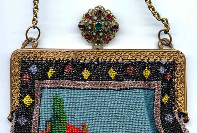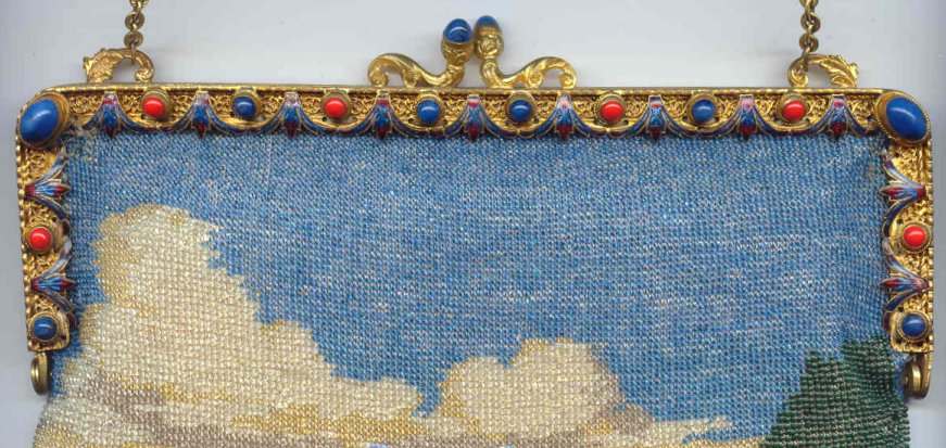 This is a truly stunning beaded purse picturing a canal scene with buildings and boats. Lush and vivid colors with just about every shade being used. Scene is set in a carpet border design of diamonds in different colors and designs. The frame is richly filigreed on both sides and is topped off with a large filigree crown jeweled clasp that is a killer! Interior is lined in black silk with gold trim. Beadwork on front is in perfect condition; back has an early professional repair to the building on the back side ... very well done and barely noticeable. This is a wonderful purse that would enhance even the finest collection. Measures 6" wide at frame, 7" wide at bottom, and almost 12" long from clasp to fringe. Previously listed at $3,250. (Click on pic for more photos.) |